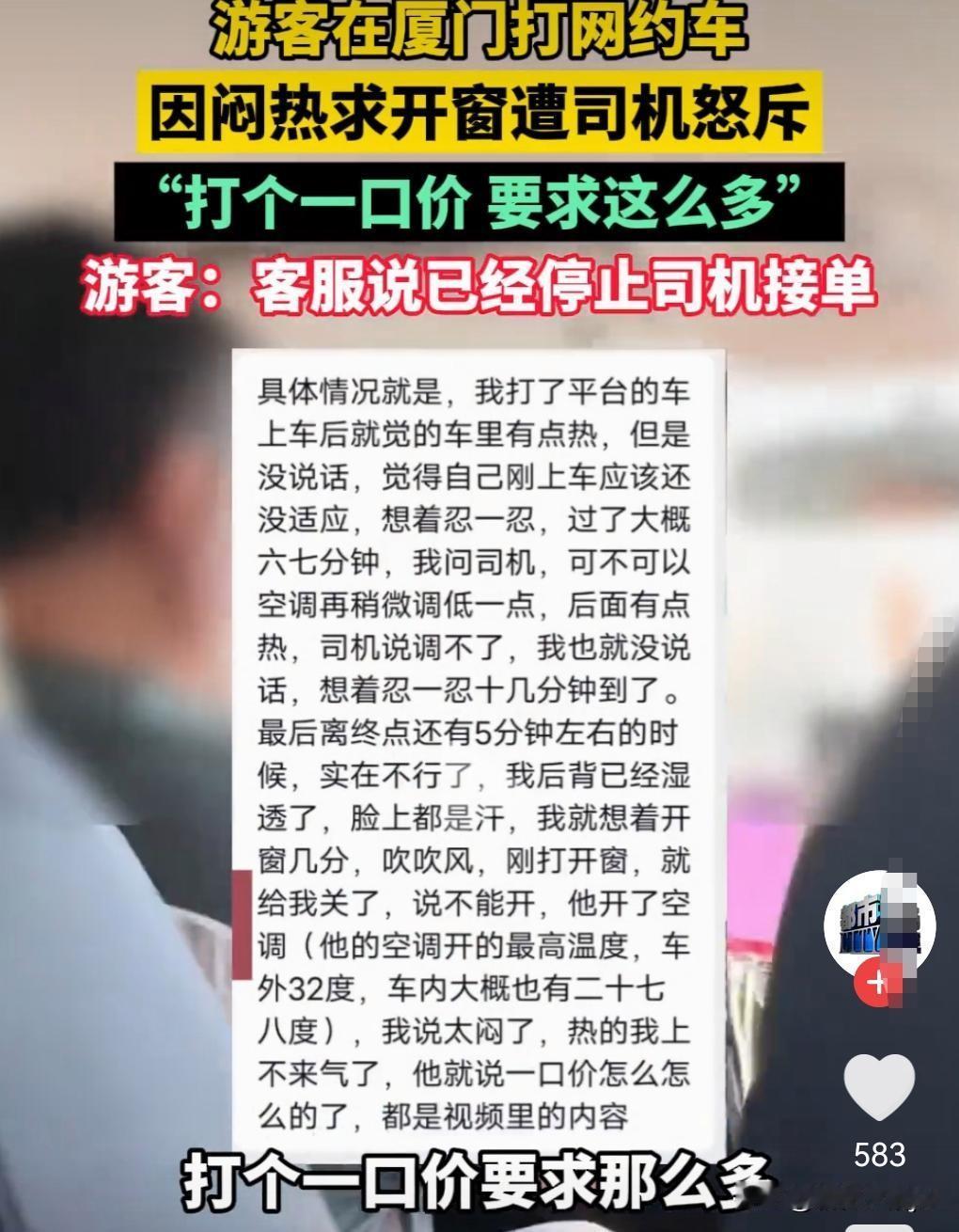 游客因闷热要求开窗被司机怒骂! 原因是游客打的一口价,司机没油水赚,心里很恼火。 当时游客说热死了, 司机就说你去死吧!典型的路怒症。 游客打车时,定的一口价,不商量。 司机挣不了多少钱,自然就不愿为你多服务。 网约车是服务行业,有挣有赔很正常。 司机连自己情绪都控制不住,怎么带给别人好心情? 毕竟开车是个高危行业,一不留神,就会翻车的! 这下好了,司机停单被罚,一家老小生活也没了着落。 唉,这回是真摊上事了!