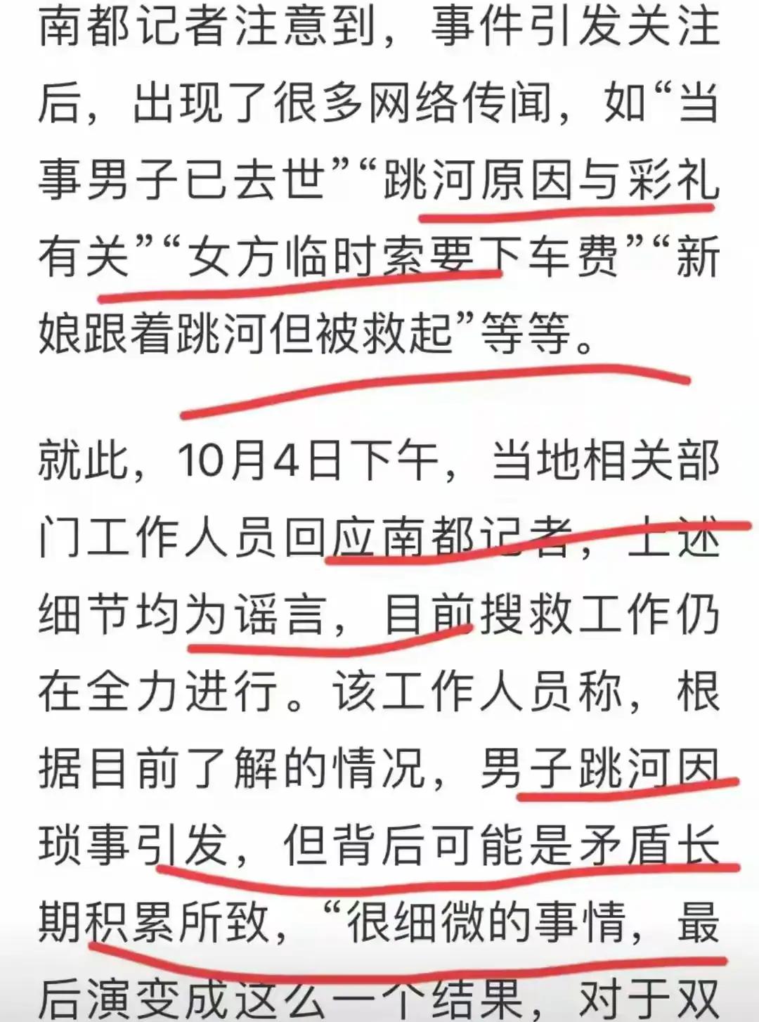 终于,陕西新郎官跳河这件事有了新定论! 不存在高价彩礼,也不存在临时索要“下车费”,之前网传的消息都是不实的,传出这种消息的人已经被警方教育并进行了行政处罚。 据新郎好友提供的朋友圈可以看的出,两个人已经交往了不少的时间,而且朋友圈照片都是彼此,感情特别稳定。 那么没有这些网传的原因,新郎官为什么会在结婚当天做出这样的极端行为呢?想来应该是长期积压的情绪在某一刻被点燃了,又或者是多年来两家因为一些事情产生了矛盾。 总之,在两个相爱的人即将走向婚礼殿堂的时候,意外却偏偏发生了,新郎父亲那句:很多事情,种种原因,听起来既无奈又心疼。 我在想,如果可以,新郎会不会自救?会不会再回来?会不会替自己感到不值? 祈祷这名29岁的小伙能平安吧,为了感情琐事丢了性命,太不值当了!