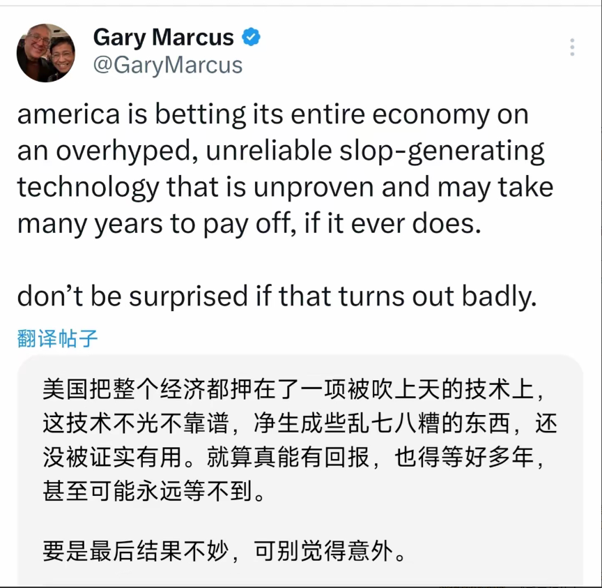 当然marcus也没有把话说死,而是担心押宝在7巨头身上太重了,而且llm可能没法最终达成通用人工智能AGI,至少短时间看不到希望!