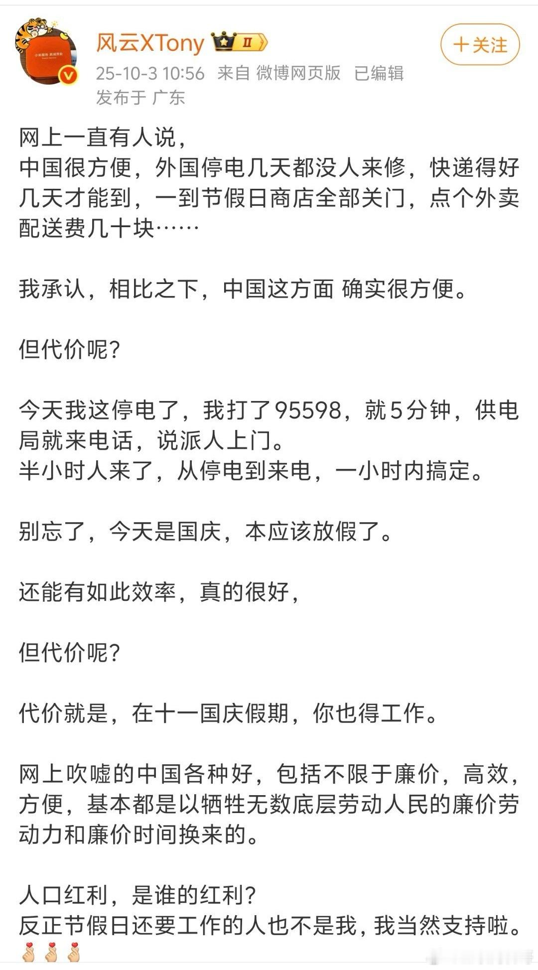 卧槽,这个大V的言论真逆天!享受到国内便利实惠的服务,不说句感谢,不为国内服务而感到幸福自豪,怎么反而搁那冷嘲热讽这是国内的廉价劳动力!这种言论,太让人寒心了!这是对国内社会底层劳动人民的不尊重!