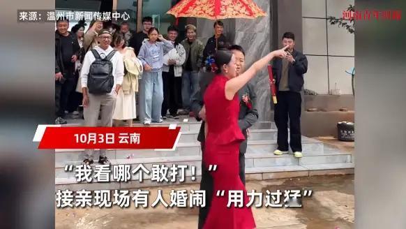 10月3日,云南,一对新人结婚时,新郎突然被其他人婚闹,竟拿藤条抽打他的腿,新娘