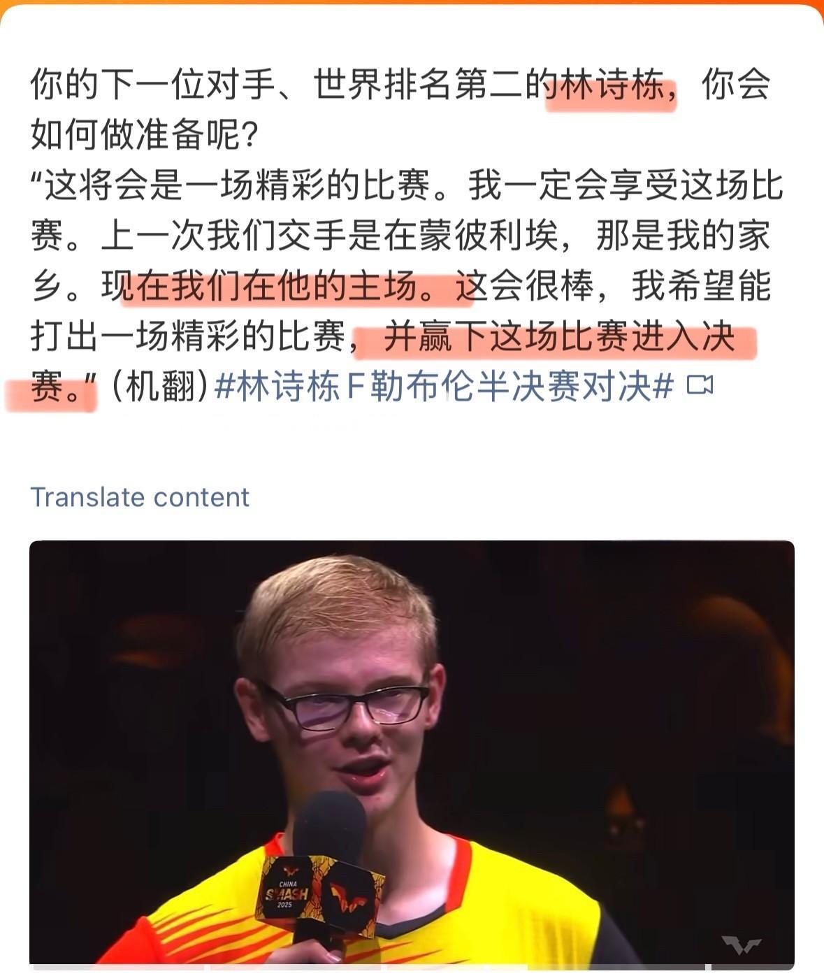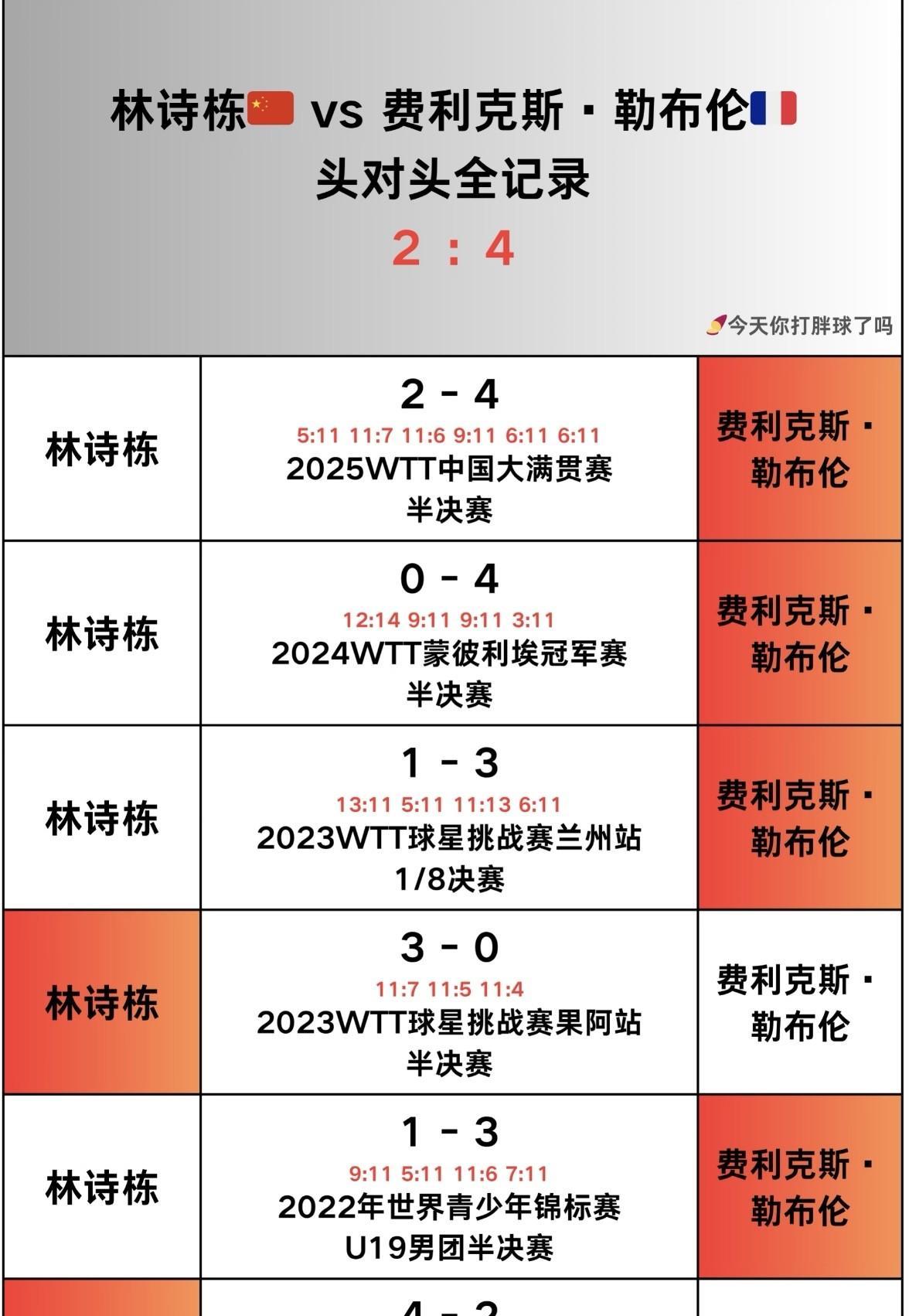 小勒布伦真心错付,终于在偶像面前证明了自己:我的上限比你想象的高。 当着王皓的面,在北京主场,小勒布伦“三杀”林诗栋。 上一次在法国蒙彼利埃冠军赛,林诗栋在半决赛遭遇小勒布伦4:0横扫绝杀。 王皓一直认为是自己没去的原因,他在澳门冠军赛和邱党闲聊时谈起过小勒布伦,他认为小勒布伦并不会走到多远的地方,“他成也节奏、败也节奏”。 持同样观点的还有直板横打的许昕,他直言“小勒布伦是到不了世界排名前六的,他也很难国乒主力,对主力造成不了多大的威胁。” 在巴黎奥运周期,这件事情是真的。 小勒布伦职业生涯从未赢过巴黎奥运周期原班人马的前四大主力:王楚钦、樊振东、马龙、梁靖崑。 在巴黎奥运会最终站上男单颁奖台时,他与张本智和、莫雷加德、雨果的区别就在于: 他还是没有赢过国乒巴黎奥运参赛选手中的任何一个人。 林诗栋很早以前就受到国乒的关注,在王皓坐镇场外的情况下,林诗栋在2023WTT球星挑战赛果阿站成功零封小勒布伦。 林诗栋后来输的两次,王皓全都不在场。 这一次,王皓在场,他可能不知道在被外媒问起“谁是你心中的乒乓球Goat”时,小勒布伦在二选一中,毅然决然选了王皓,而舍弃了巴黎奥运会男单冠军。 他在技改,在努力摆脱吃青春饭的速度流,这一次,小勒布伦在王皓的眼皮子底下,在中国北京的主场,实现对林诗栋的三连胜,越到后来,林诗栋越没有还手的力气。 小勒布伦超出了王皓的预期,超出了林诗栋赛前做的心里所有准备。 王皓在年初只点了一个最大威胁外协的名字:张本智和。 小勒布伦在北京大满贯扛起了王皓当年在郝帅儿子百日宴被迫舍掉的大旗:张本智和算什么?我小勒布伦也能三连胜林诗栋!