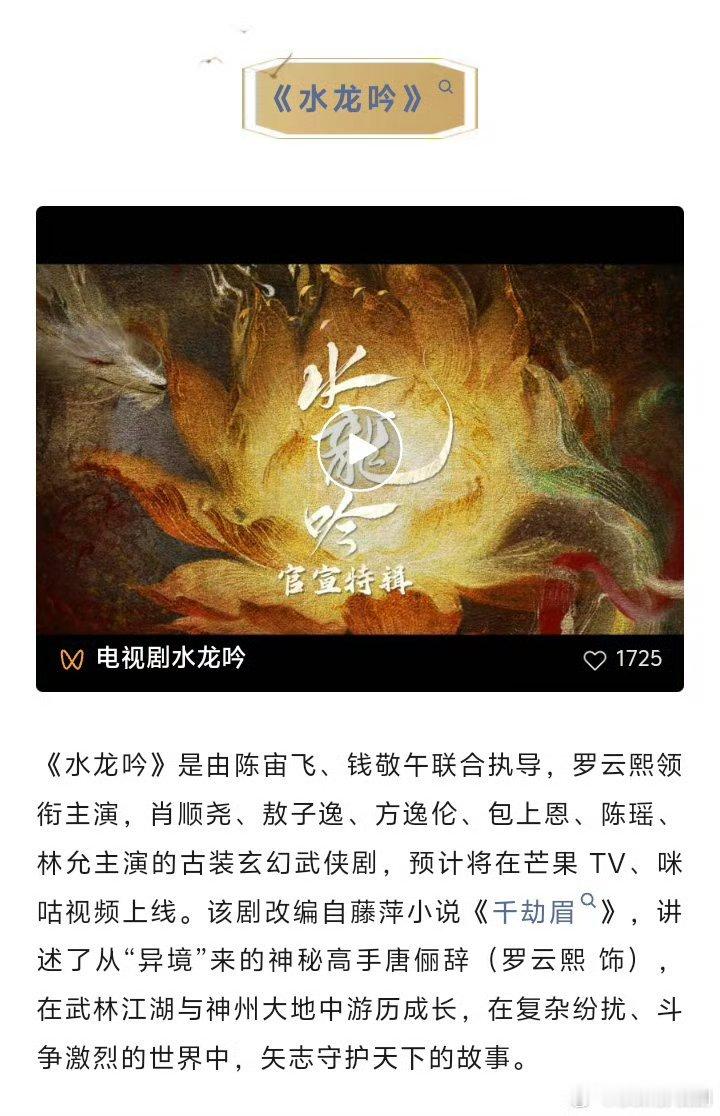 罗云熙水龙吟20号招商结束,21号定档,全力海外发行,有出海任务。那可就太期待啦