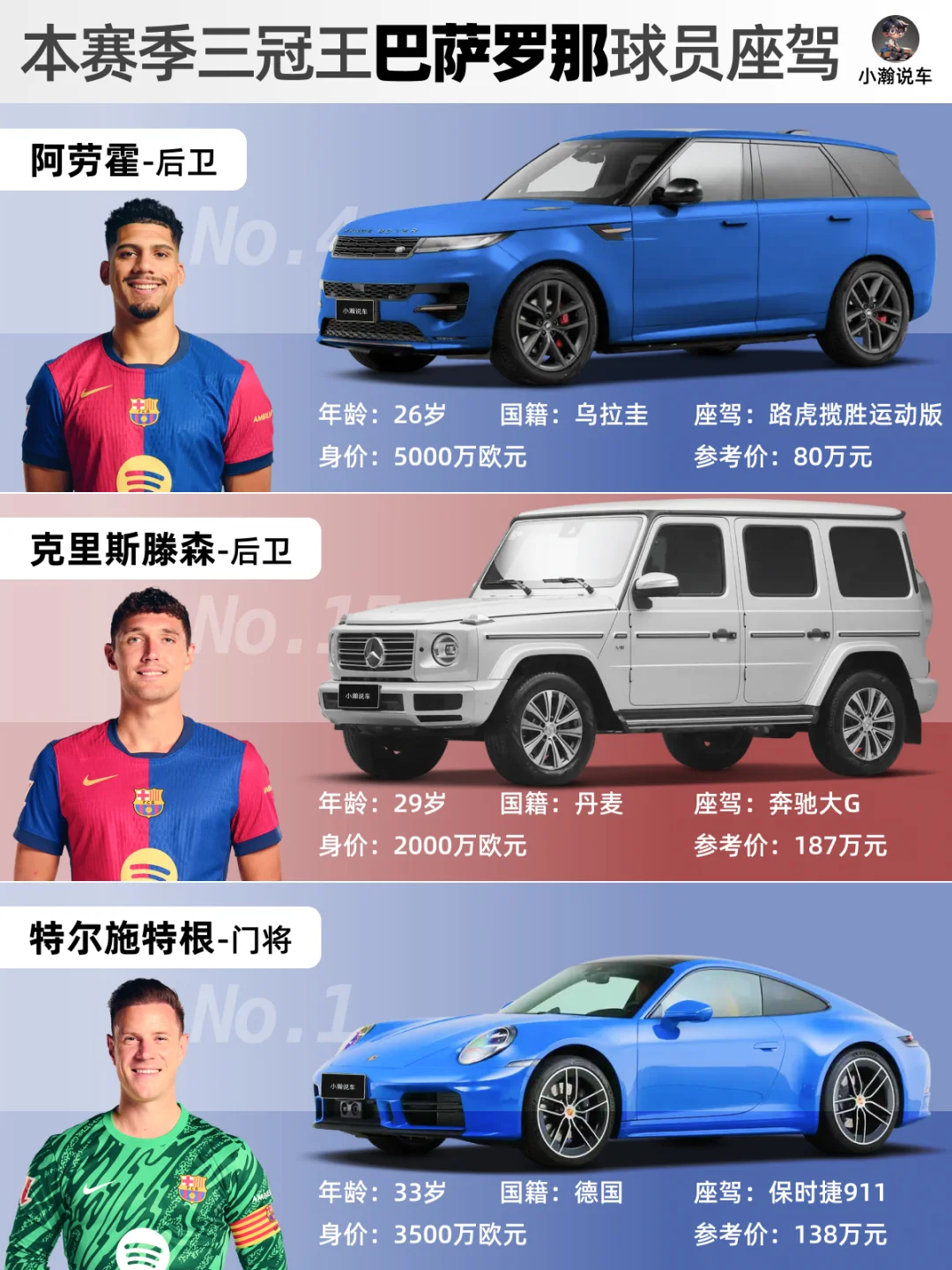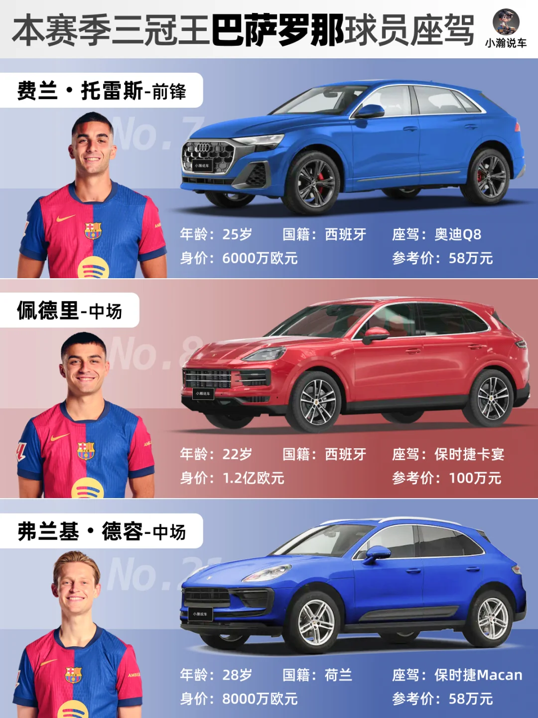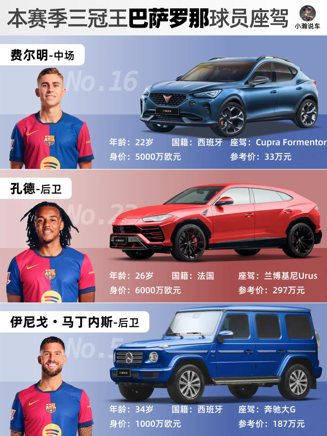 随着巴萨罗那客场2-0战胜同城死敌西班牙人队,这支浴火重生的宇宙队提前2轮获得了本赛季西甲🏆! ⚽️虽然欧冠半决赛遗憾输给了国米老男孩,但相比于赛季之初的无人看好,到“四杀”皇马成就本赛季西班牙各大赛事的三冠王,这支涌现出多位年轻天才的“梦四”巴萨正式宣告起航!未来可期! 🚗那么,天才小孩哥们都开的什么车呢?和小瀚一起来看看!