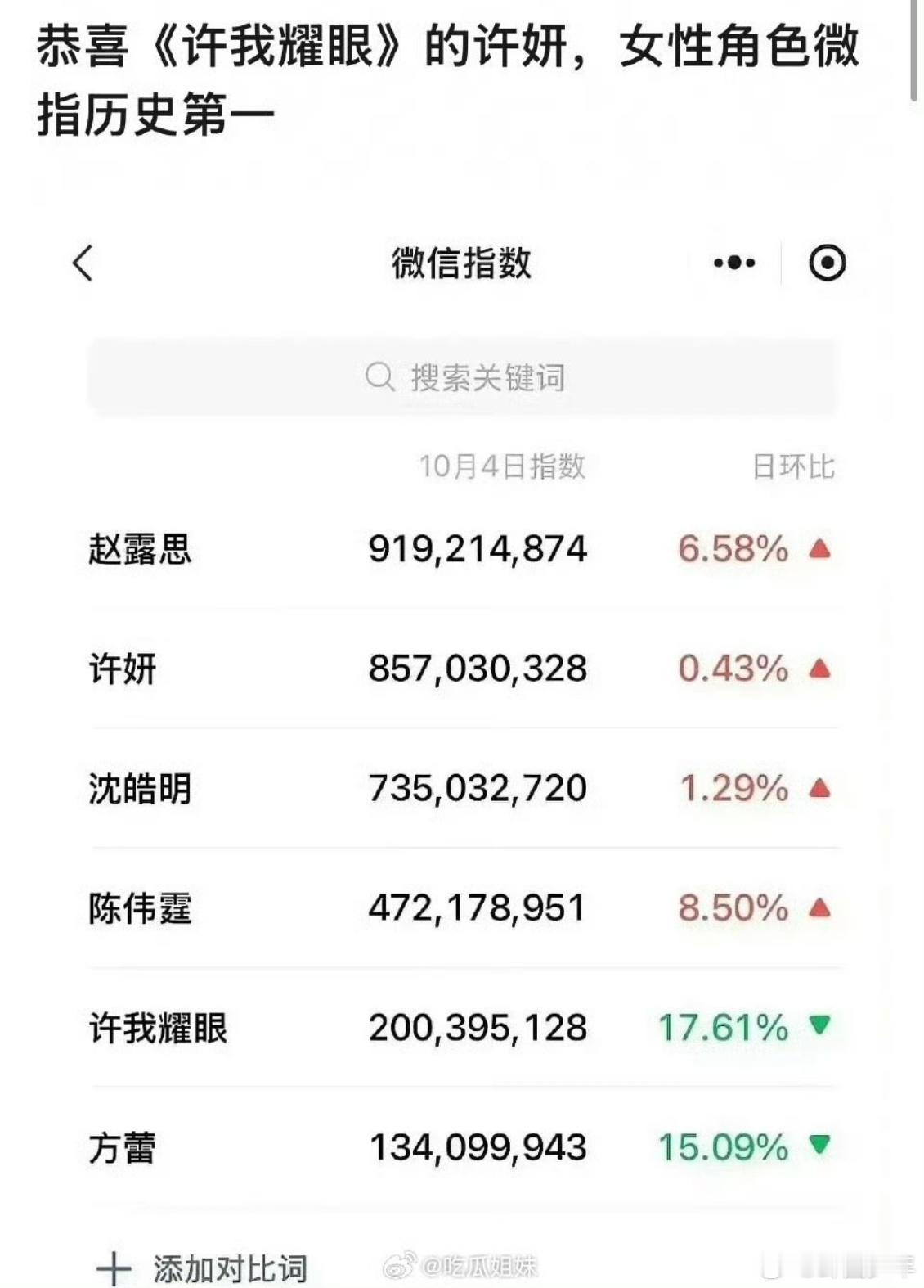 许妍女性角色微指历史第一赵露思在《许我耀眼》里饰演的角色许妍拿下女性角色微指历史