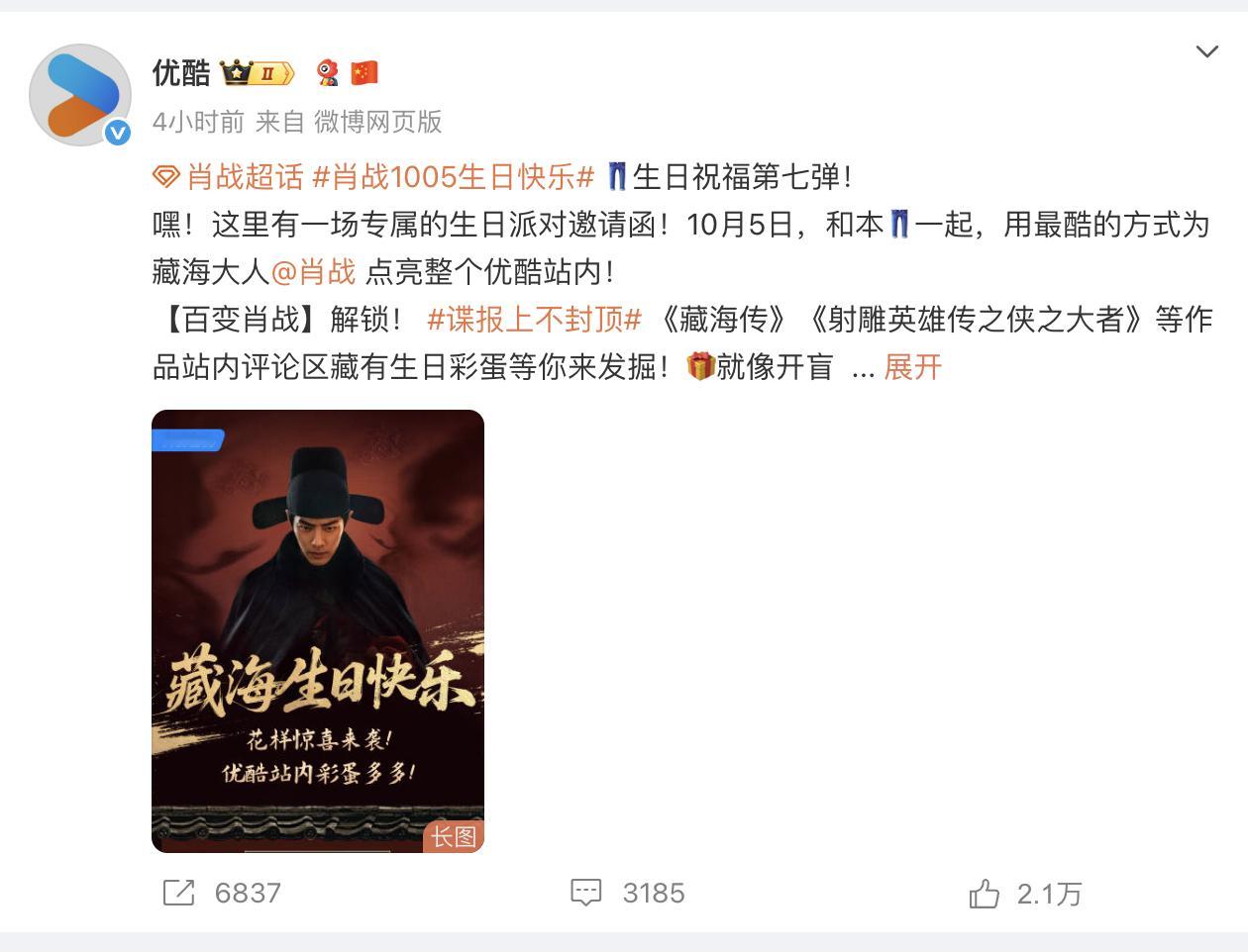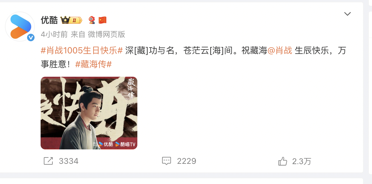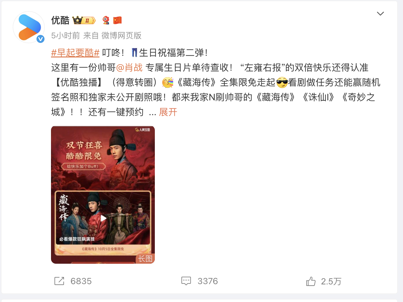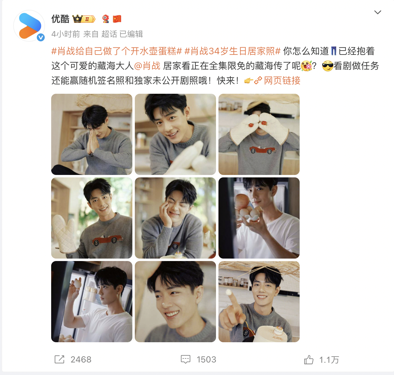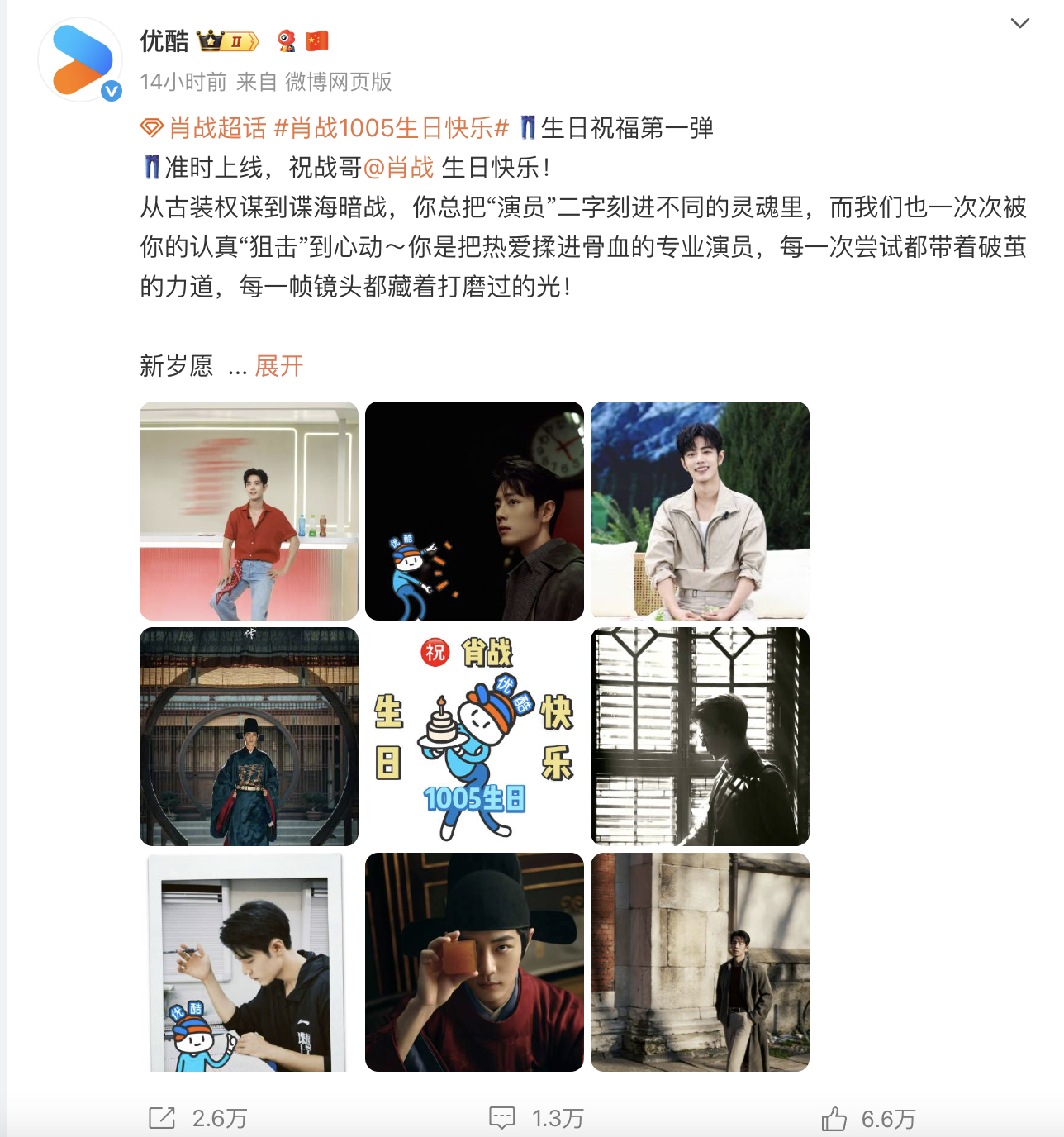 优酷一直发肖战,肖战生日今天,👖从0点起11小时内已经发了12条肖战微博了,看