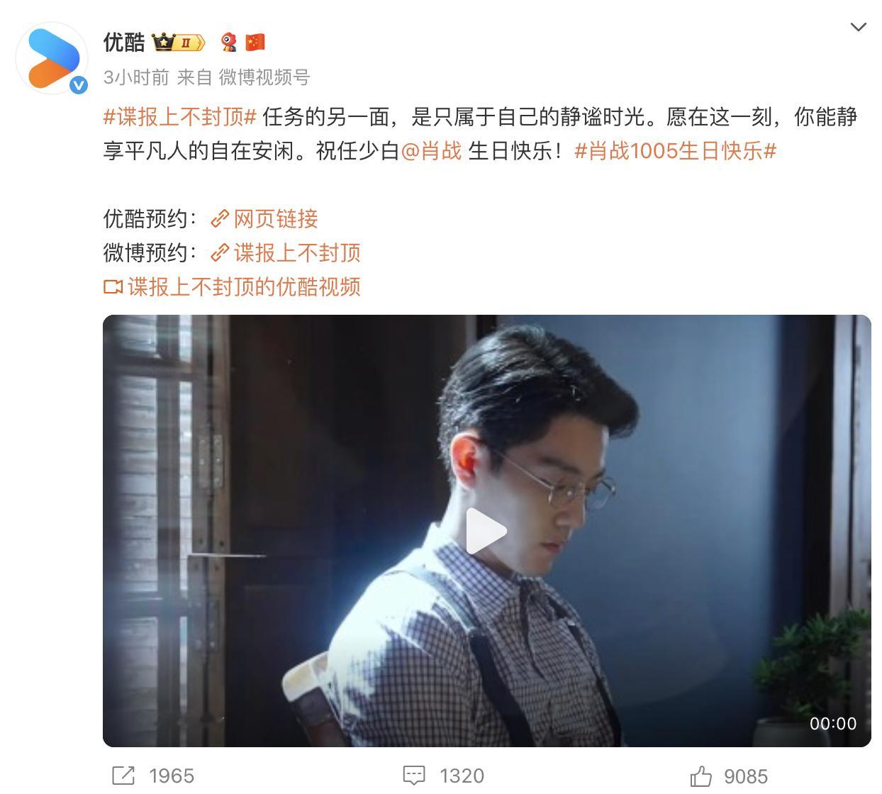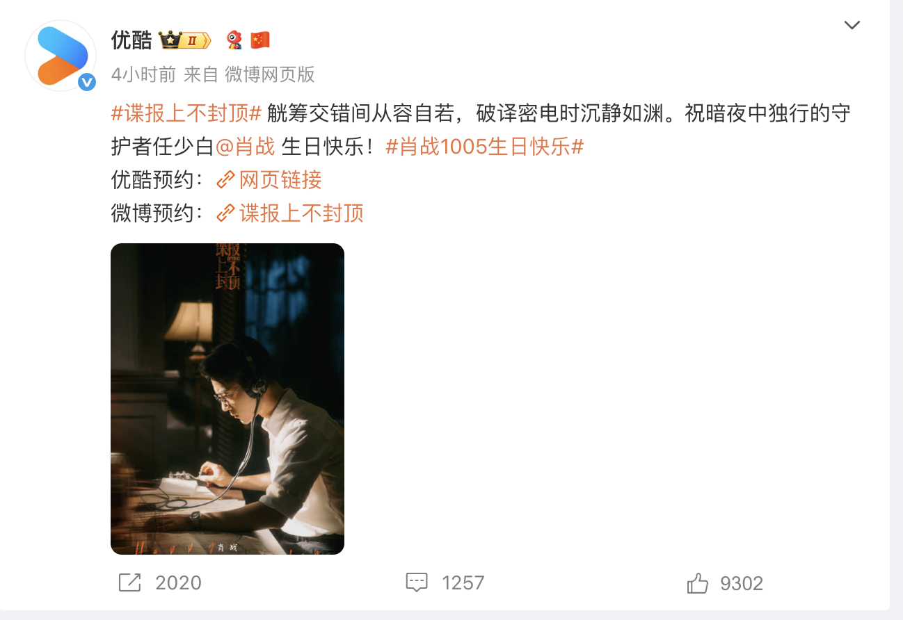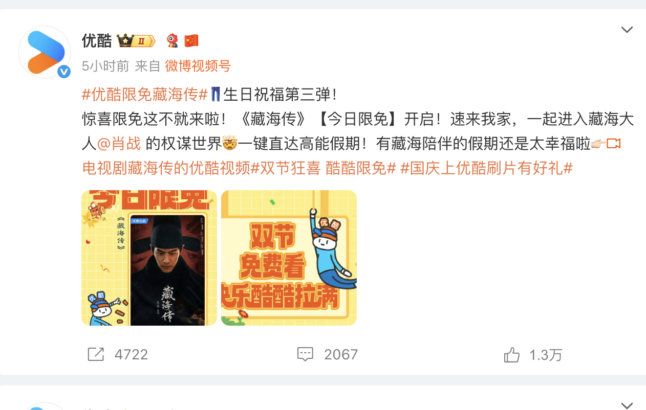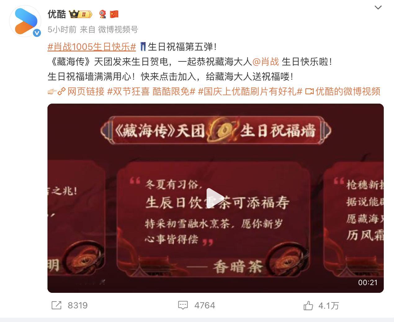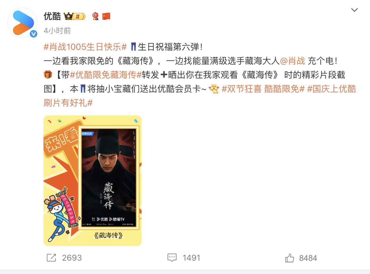 优酷一直发肖战,肖战生日今天,👖从0点起11小时内已经发了12条肖战微博了,看