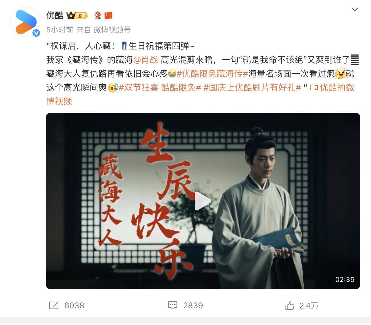 优酷一直发肖战,肖战生日今天,👖从0点起11小时内已经发了12条肖战微博了,看来是大爆剧《藏海传》让👖赚翻了。 腾讯对肖战求复合文学 肖战生日上了世界趋势 果然爱肖战会发财是公认的
