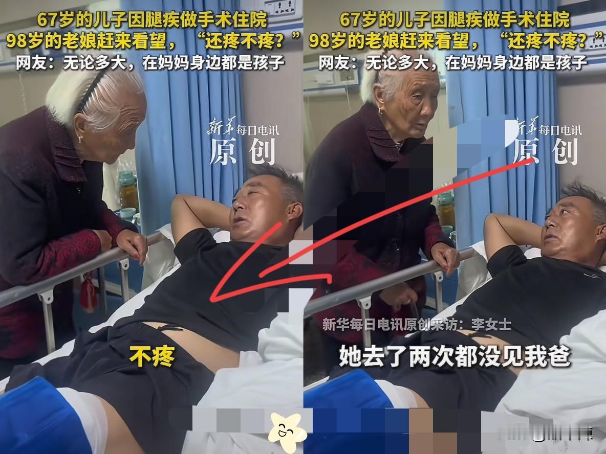 河南,67岁男子做手术躺病床上。突然,98岁母亲来看望,问他: “还疼不疼。”他说: “不疼。”网友: 不管多大岁数,有母亲的牵挂,就是幸福的。 自己都快百岁的人了,眼里却全是对儿子的心疼! 儿子早料到老妈会担心,住院时特意没说,还叮嘱家人一起瞒着! 可老妈心里门儿清,连着两次去儿子家都没见着人,就猜肯定出事儿了,软磨硬泡让家人带她来医院! 看着病床上插着输液管的儿子,老妈没说啥漂亮话,就反复念叨“好好养着,别着急”,那语气跟小时候哄生病的娃一模一样! 总有人说“有妈在,多大都是孩子”,今天算彻底信了。67岁还能被98岁的老妈这样疼着,哪是简单的“幸福”能概括的? 再说老妈打扮得干干净净,头发梳得整整齐齐,说话思路也清楚,一看就是家里小辈照顾得周到,这样的家风多难得啊! 现在咱们总忙着上班、拼生活,总觉得爸妈还能等,可谁知道意外会不会突然来? 其实能被爸妈牵挂着,能有机会陪着他们慢慢变老,才是这辈子最该攥紧的福气! 这种良好的家风终将造就一个庞大而兴盛的大家族,民族的振兴和希望正是寄托于一代代人的传承!