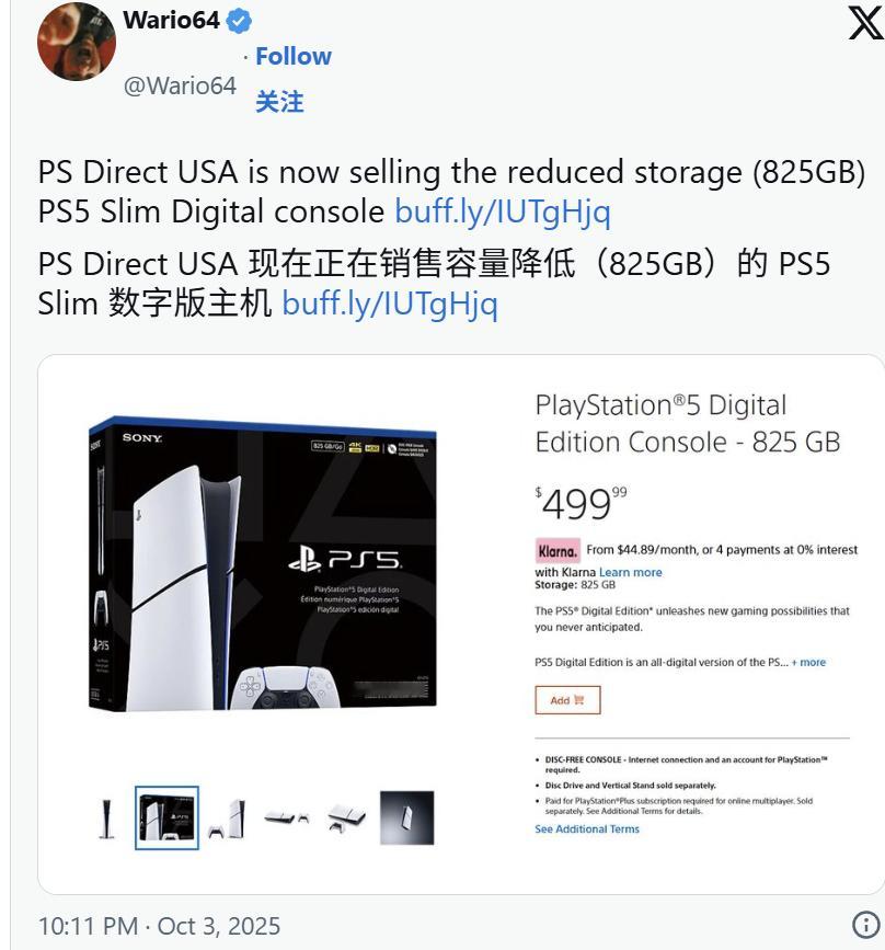 此前,我们报道了新版PS5 Slim SSD存储容量降至825G并在欧洲地区上市。据爆料人Wario64透露,美国地区也开始上架新的PS5 Slim缩水版,新款主机的存储空间从1TB缩减至825GB。