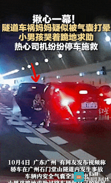 揪心的一幕:一辆轿车在隧道内发生事故,安全气囊全部弹出,坐在驾驶位的妈妈疑似被安全气囊打晕,后座的小男孩看到妈妈晕倒了,跪在地上哭着向其他车辆求助,救救自己的妈妈,热心司机纷纷停车施救。 看到小男孩跪在地上,双手止不住颤抖,此刻他应该很害怕失去妈妈吧,看到这一幕,眼泪不自觉掉了下来。 (视频来源:红星新闻)