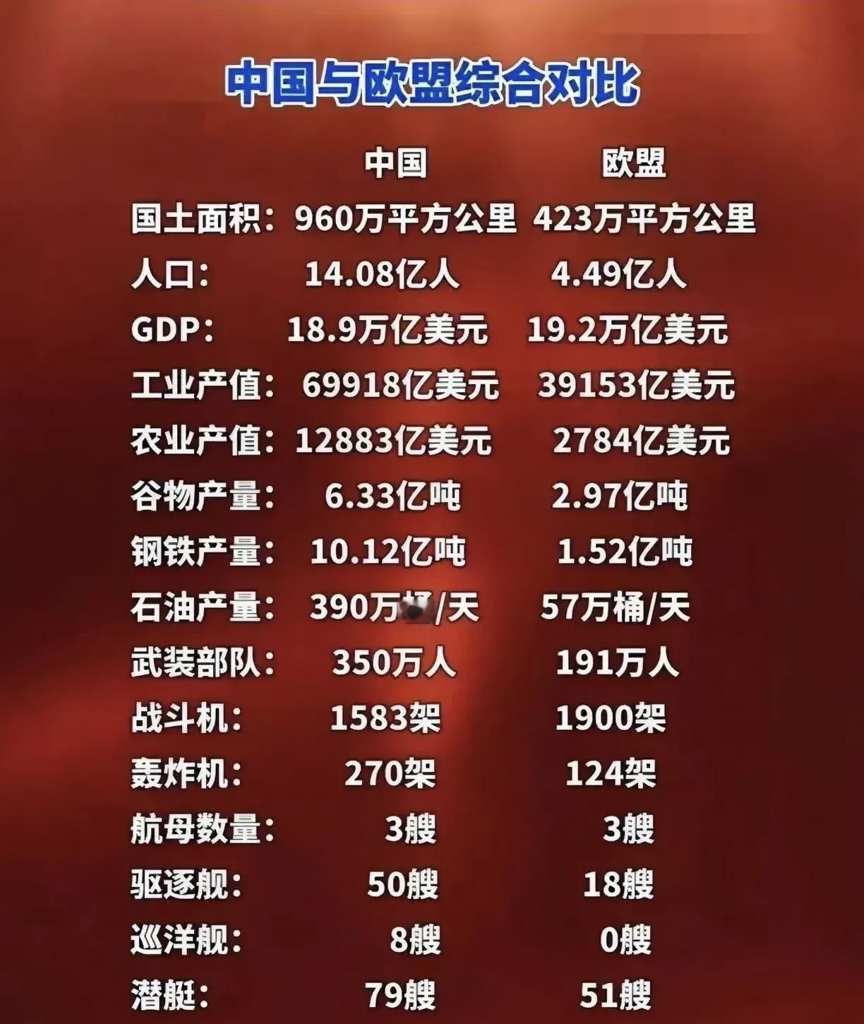 好家伙,看到轰炸机数量瞬间就不淡定了, 欧盟从哪里捡到了127架轰炸机?难道是美国空军把自己的轰炸机都扔到了大西洋,让欧盟国家给捡到了? 其实,欧盟的经济实力还是非常强的,毕竟欧盟27个成员国,有22个是发达国家,全球发达国家的一半在欧盟,但是军事实力欧盟就不行了。 欧盟军事实力最强的国家还是英国和法国,不夸张地说,英法两国海军加起来不如一个南海舰队,英法陆军加起来不如南部战区陆军,英法空军加起来不如南部战区空军!