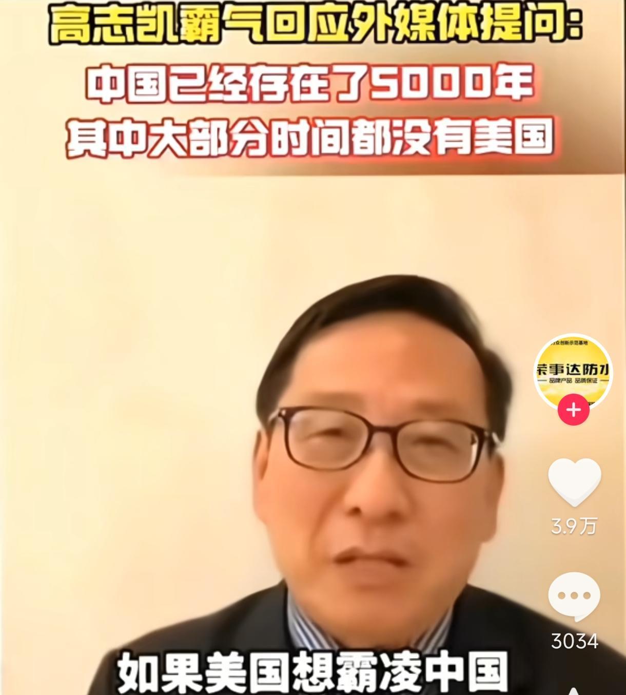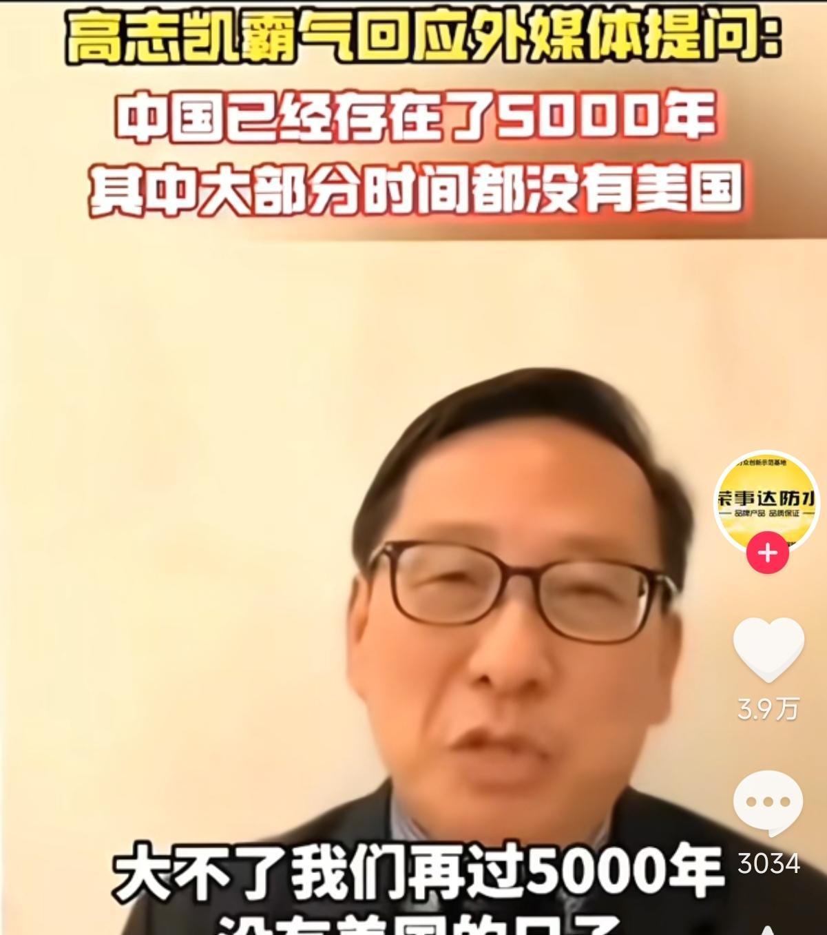 高志凯是中国最伟大的民族英雄之一!他的成就不在刀光剑影的光彩里,而在唇枪舌战中,但其社会价值和历史影响不次于任何沙场业绩。 尤其他那句“如果美国想霸凌中国,大不了我们再过5000年没有美国的日子”的怼外媒绝句实在太壮观了,简直气吞山河!气势如虹! 那潜台词的意思是,如果美国再继续霸凌中国,那美国将不复存在。这句话将美国怼成一个在中国巨龙面前如蝼蚁般的跳梁小丑,简直不能再绝了! 试问,世界上还有谁能做出如此绝妙的应答?