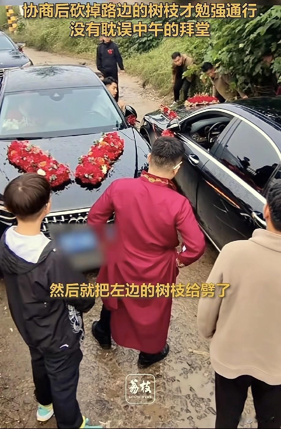 山东,两对新人的婚车队在乡间小道的桥洞口相遇,因为“不走回头路”的习俗互不相让,僵了两个小时,最后砍断路边树枝,才勉强通过。 事发地是个只能过一辆车的山区桥洞入口,洞内路面宽2.8米,婚车宽约1.8米,不能错车。洞外路面稍宽些,却被半人高的树枝挡了半边。 两对婚车一队头车是黑色奔驰,另一队头车是黑色奥迪的,一个要进桥洞,一个要出桥洞。按菏泽当地的规矩,婚车一旦开上路就不能走回头路,倒车更不行,说是“不吉利”,象征婚姻“倒退”,所以两边谁都不肯退。 就这么僵了俩小时,后面的车排起长队,喇叭声吵个不停,新人急得在路边转圈发愁。 有人把情况发到网上求支招,网友们脑洞很大,说原地摆酒的,让新人徒步的,还有建议互换婚车的,虽然都没法实现,但乐子倒是不少。 最后,伴郎团一起把路边的树枝砍断,奔驰车就贴着树那边一点点蹭过去。等它过去后,奥迪车队也顺利开了,最后两家婚礼都没耽误。 婚姻过得好不好,要看两个人能不能互相包容,跟婚车走啥路线没什么关系,路上让一步,不仅不丢面子,还显得这人敞亮、有格局。 婚俗的核心是图个喜庆和睦,也该跟着时代变一变,年轻人不要被那些没必要的讲究绑住。