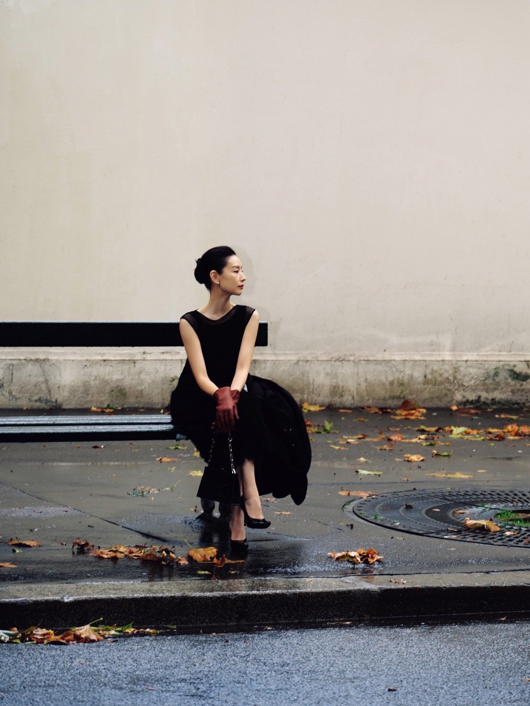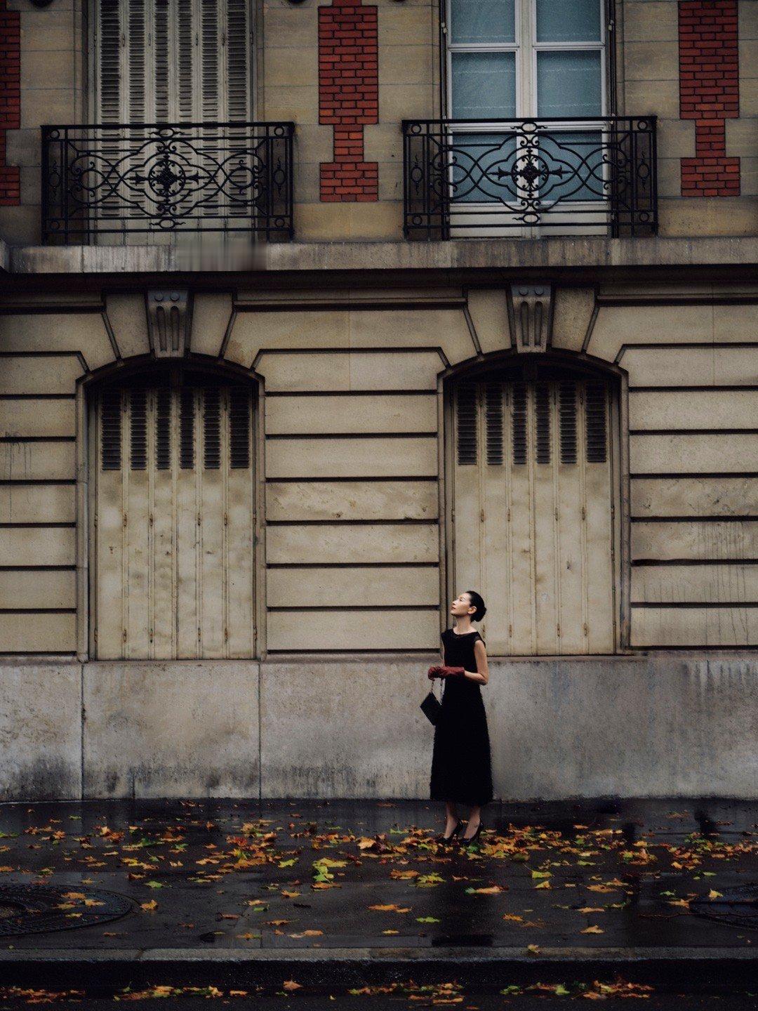 董洁优雅小黑裙巴黎街头惊现人间水墨画!董洁小黑裙配盘发,在雨中撑伞的模样宛如古