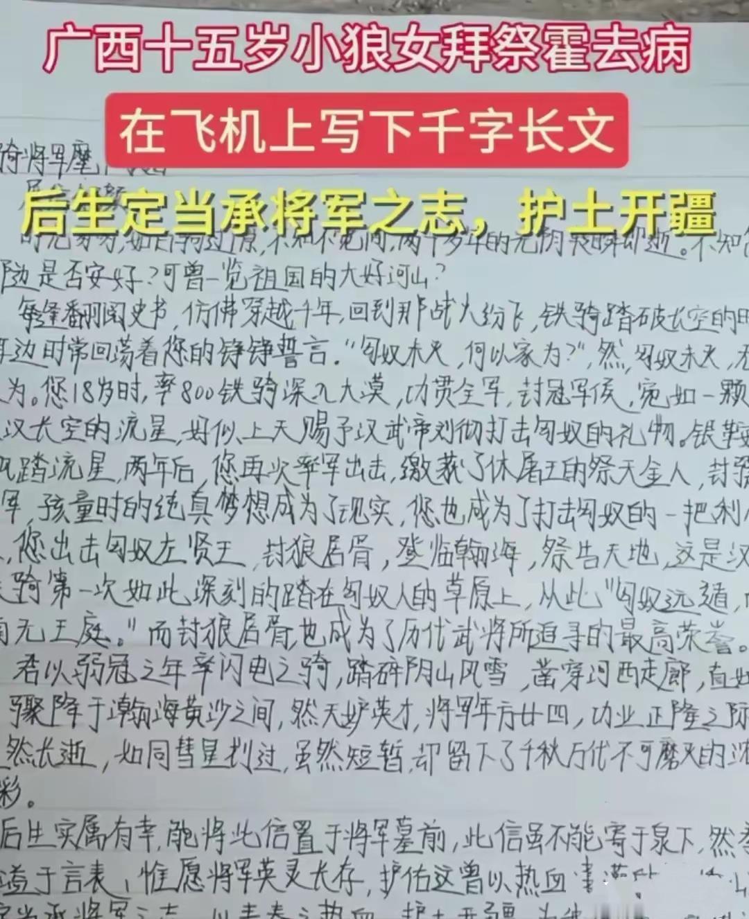 15岁小狼女让各大媒体争抢报道,她一举动,让国人看到祖国越强盛 15岁的广西小狼女,去拜祭中国武将霍去病,留下了千字长文,文中坚定的信念,让国人看到了新一代的强大希望! 内容如下: 骠骑将军麾下敬启: 展信舒颜。 时光匆匆,如白驹过隙。不知不觉间,两千多年的光阴转瞬即逝。不知您在那边是否安好?可曾一览祖国的大好河山? 每逢翻阅史书,仿佛穿越千年,回到那战火纷飞,铁骑踏破长空的时代。 耳边时常回荡着你的铮铮誓言: “匈奴未灭,何以家为” ! 然,匈奴未灭,无以家为。您18岁时,率800 铁骑深入大漠,功贯全军,封冠军侯,如一颗划破大汉长空的流星,好似上天赐予汉武帝刘彻,打击匈奴的礼物。银鞍白马,飒踏流星。 两年后,您再次率军出击,缴获了休屠王的祭天金人,封膘骑将军,孩童时的纯真梦想,成了现实!您也成为了打击匈奴的一把利刃! 后来,您出击匈奴左贤王,封狼居胥,登临瀚海,祭告天地,这是汉人的铁骑第一次如此深刻的踏在匈奴人的草原上,从此“匈奴远遁,而漠南无王庭”。而封狼居胥,也成为了历代武将所追寻的最高荣誉。 君以弱冠之年率闪电之骑,踏碎阴山风雪,凿穿河西走廊,直如天兵骤降于瀚海黄沙之间。然天妒英才,将军年方廿四,功业正隆之际,竟溘然长逝,如同彗星划过,虽然短暂,却留下了千秋万代不可磨灭的浓墨重彩。 后生实属有幸,能将此信置于将军墓前。此信虽不能寄于泉下,然拳拳之意,溢于言表,惟愿将军英灵长存,护佑这曾以热血浇灌的锦绣山河,后生定当承将军之志,以青春之热血,护土开疆,为我泱泱华夏更添一抹光彩。 将军放心,如今家国无忧,天下太平,这盛世,如您所愿。 这就是小狼女的千字长文,洋洒着她那报效祖国的热血,以将军为榜样,护土开疆的决心! 霍去病短暂又辉煌的一生,是中国武将的天花板,在短短的几年从军生涯里,他已经达到了中国军功的巅峰! 封狼居胥、禅于姑衍、饮马瀚海…… 引用小狼女的一句,将军放心,如今家国无忧,天下太平,这盛世,如您所愿! 向您致敬! 网友评论: 这封祭拜将军的长文,应该登上《解放军报》,让更多的民众看到! 读完此文,已不知不觉的泪流满面,一个小女孩的偶像居然是霍去病将军,这让我们看到祖国的未来,只会越来越强盛,真不愧是浪军后代。 一生不展凌云志,枉为男儿八尺躯,巾帼何需让须眉,天下舍我还有谁?!世间有如此胸怀报国之志的小狼女,此乃我中华之大幸,黎民之万福!少年智,则国智,少年强,则国强,诚如此,我中华万载无忧也! 有这样的少年,真乃家幸国幸,何愁国家不强,有志气,有抱负,好好学习必堪大用。 她祭奠霍去病的文章应该出现在中学课本里,让我们的下一代都成为各行各业的有志青年。 37岁的我自愧不如,少年强则国强,少年智则国智,少年富则国富。少年好样的!!! 玩手机,无意间看到的。看完文章,好感动。我自己眼睛已经湿润了。 15岁的小女生,写出了这么感动的文章。应该分享到自己的朋友圈,让更多的人,看到这篇文章。 为丫头片子点赞。 读此文章,不住感慨,有此文采,有此心胸,足能看出是理国治家之才,少年智则国智,少年强则国强,我巍巍中华的伟大复兴之路,必将是一片坦途! 一个小女孩的偶像居然是霍去病将军,她让我们看到了祖国的未来! 霍去病将军虽英年早逝,但他自18岁从军短短6年之中就为中华大地立下汗马功劳。他是中国的英雄也是全体解放军将士的偶像。华夏文明永远铭记他! 看到此文莫不热泪盈眶。想我华夏后继有人,我辈当庆幸生在华夏,虽不能为国洒热血,但当尽力维护祖国的一草一木,不让豺狼侵犯!