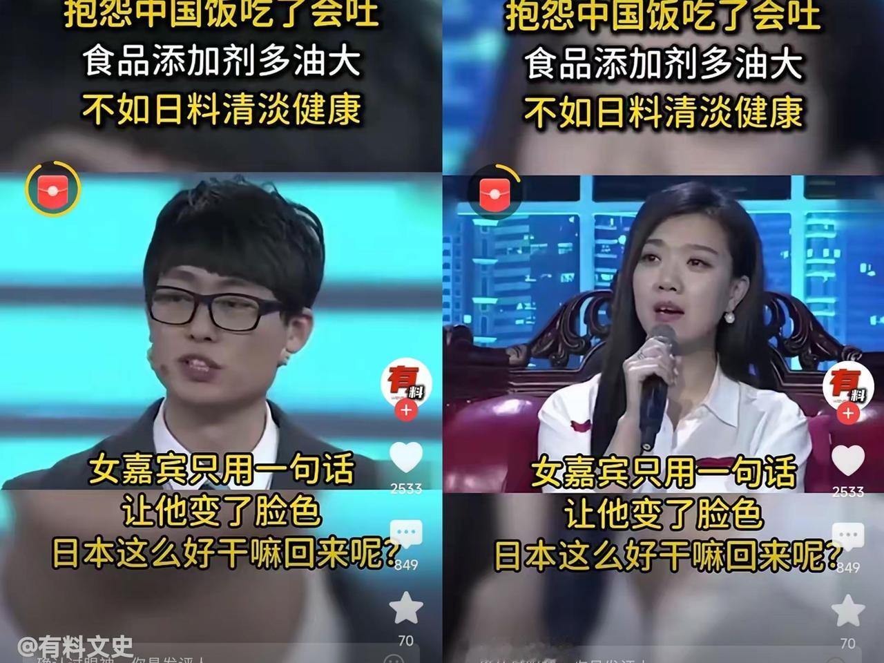日本留学归来的求职者,抱怨中国饭吃了会吐,食品添加剂多,油大,不如日料清淡健康,女嘉宾一句话:中国不吃核辐射,日本那么好,你回来干嘛!让他变了脸色。 除了不发达国家没有添加剂这需要,中国是世界上添加剂最少种类和量的。包括俄罗斯也泛滥得厉害,低于0.1%就可以不标隐。 其实没有国家完全不需要食品添加剂,哪怕是不发达国家,食品储存、加工也得靠基础添加剂,完全无添加在现代很难实现规模化供应~ 听到一个留学生说,以前常在厂门口小吃摊买早点,刚回来特地再去品尝,却腹泻了,另二个留学生家属也说过这样的事,不知为什么