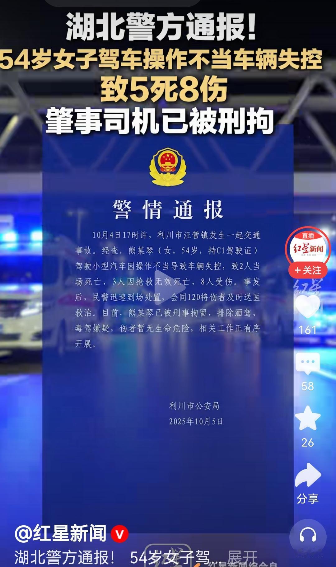 利川5死8伤车祸,54岁女司机虽被刑拘,但仍有4个细节让人难以理解!一、刹车