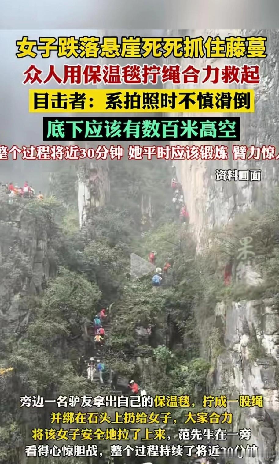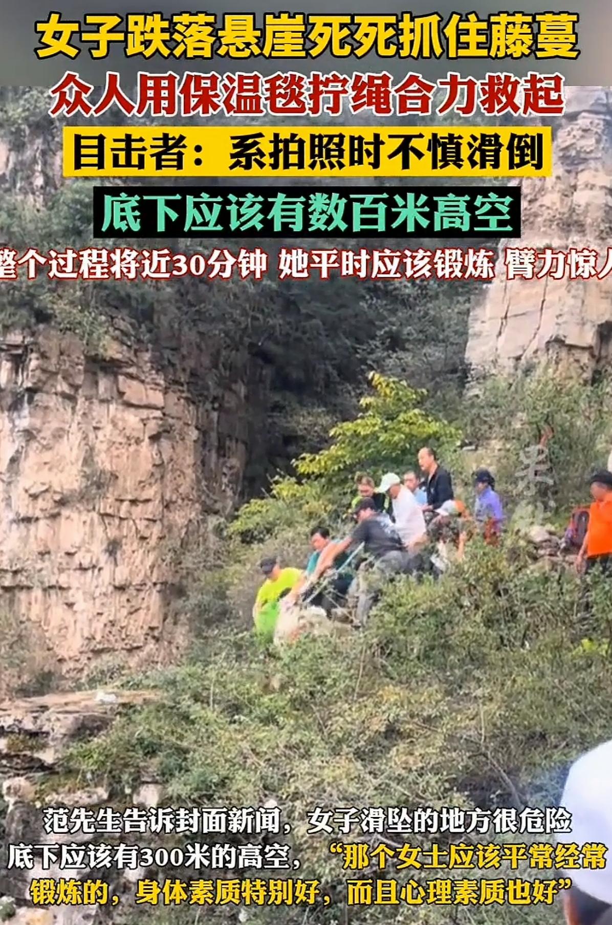 真是命大啊!女子坠崖命悬一线, 驴友巧用保温毯拧绳生死营救 ! 10月4日上午9点多,太行山瑛姑峡,一群游客爬到山中,见到这里绝美风景,碧水青山,就想拍照留个纪念! 她们同行几个,互换着给对方拍照,拍的太尽兴了!轮到女子拍照时,她脚下突然一滑,身体失控坠落悬崖! 啊!女子发出惊叫!身体下落的一瞬间,求生本能瞬间爆发!她猛地伸出双手,死死攥住岩壁上一丛坚韧的野藤!纤细藤蔓承受住下坠巨力,勒得她手掌钻心刺痛。 她孤悬峭壁,像一片枯叶贴在万丈绝壁!时间仿佛凝固,每一秒都漫长得令人窒息。低头是吞噬一切的幽暗深渊,恐惧如冰水浸透骨髓。她听见自己心脏疯狂擂鼓,血液在耳中奔涌咆哮。 “撑住!千万不能松手!” 这个念头死死钉进脑海,压倒了所有尖叫。肌肉在燃烧,双臂抖如筛糠,每一次呼吸都牵扯着濒临崩溃的神经。她死死咬住下唇,咸腥味在口中弥漫,那是绝望的味道,也是活下去的倔强。 危急时刻,同行驴友反应神速。目睹险情的登山者们立刻展开救援。时间就是生命,每一秒都关乎生死。 看下面300多米高的悬崖,“我快没有力气了,”女子喊到,绝望中带着恐慌! “坚持住,坚持住,不要往下看!”一旁的游客向女孩喊话,鼓励她!一定要保持体力! 急中生智化解无工具困境。驴友迅速掏出随身携带的银色保温毯。大家合力撕开毯子,拧!拧!拧!铝箔毯硬是绞成一股救命绳索! 众人将这条临时“生命线”,一系在石头上,一边把另一头奋力抛向女子。绳索末端在空中摇摆,终于被女子颤抖的手抓住!她牢牢系紧生的希望,仿佛抓住了救命的浮木。 悬崖上演惊心拉锯战。上边,众人咬紧牙关,青筋暴起,一寸一寸回收绳索。下边,女子双脚蹬岩,拼尽全身力气向上攀爬。每一次发力,断裂的指甲都抠进岩缝,留下斑斑血痕。 漫长的三十分钟耗尽所有力气。当女子身体最终被拉回安全平台,人群爆发出欢呼!她瘫软在地,剧烈喘息,劫后余生的泪水混合着冷汗滑落。 目击者心有余悸道出原因。“她拍照时没踩稳,滑下去的!” 那一刻的失足,差点成为永恒的句点。 滑坠点选得实在凶险,游客拍照,就想拍照拍些看起来跟平时不一样的照片,殊不知,那些电影里的特技,在这没有保障的悬崖峭壁,太危险了! 拯救过程中, 女子展现了超人般的臂力。她单凭双手吊住全身重量,指关节因过度用力而惨白变形。范先生感叹:“这臂力,绝了!平时肯定是有锻炼过的!” 有网友说:对大自然敬畏之心,防范不能多一点吗? 意外随时发生!每年为拍照出意外的不在少数,千万要珍惜生命! 你们对此时怎么看?爬山坠崖 徒步坠崖 女驴友坠崖