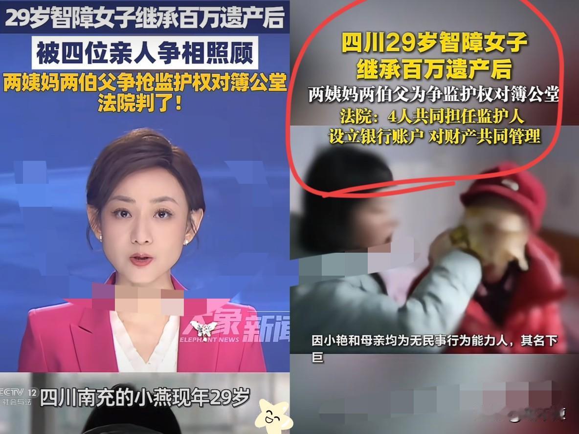 “这就是人性!”近日,四川南充,一名患有智子障碍的29岁女子继承了一百多万遗产!以前靠政府补贴和父亲的微薄收入过活,那些姨妈、伯父们从没主动搭过手! 可自从父亲意外去世留下90多万赔偿,再加上外婆留下的20多万遗产,这群亲戚突然就"上心"了,争着要当小艳的监护人,吵到法院还互相指责对方是奔着钱来的! 说穿了,这哪是抢着照顾人,分明是盯着那百万遗产的支配权! 要知道法律早有规定,监护权是沉甸甸的责任,敢动被监护人的一分钱都得担法律责任,之前上海就有监护人偷偷转走被监护人78万存款,最后被判刑的例子! 还好法院的判决够清醒,让四个亲戚共同当监护人,再加上社区全程监督遗产账户,把监护责任和财产管理拆开来约束,既防了私心,也给小艳多了层保障! 最让人心疼的是小艳,她或许不懂钱意味着什么,却要被当成"香饽饽"争抢,这种带着算计的"关心",比没人管更寒心! 大家对此怎么看?