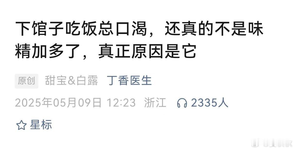 其实,这还真不是味精的锅。我们之所以会感到口渴,主要是钠元素在作怪。人吃了含钠高的食物,会提高渗透压,大脑就会释放口渴的信号,让我们多喝水,去稀释血浆,让渗透压恢复正常。