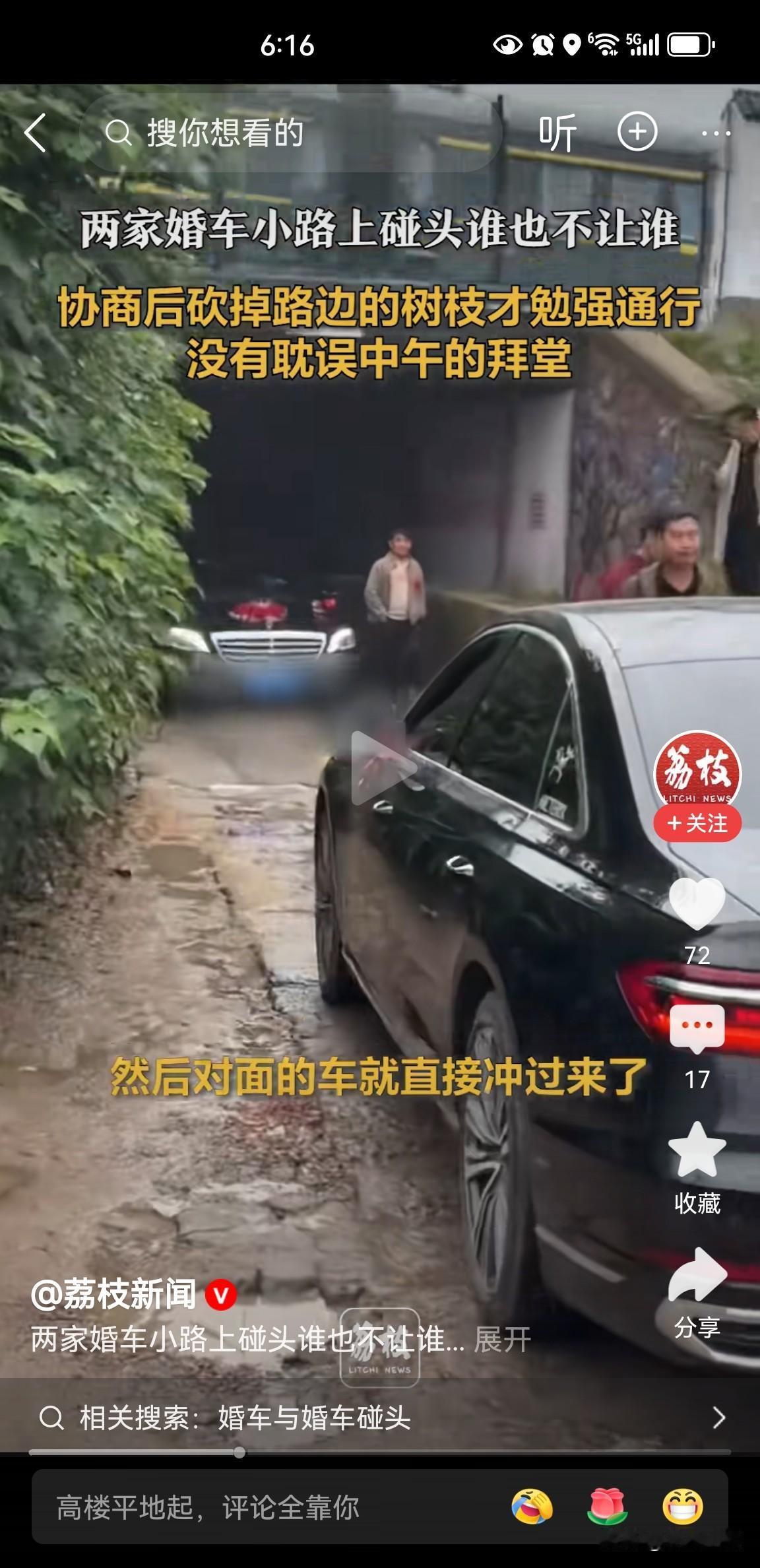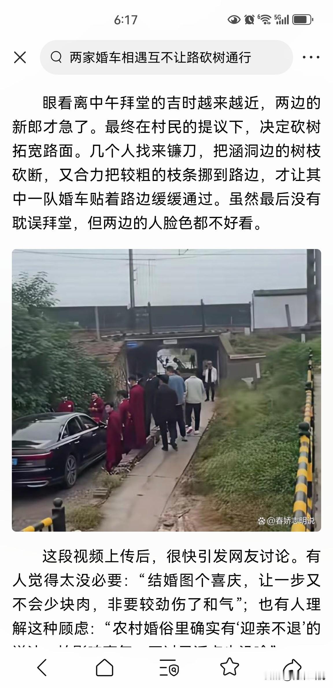 山东菏泽,两队娶亲的婚车狭路相逢,互不相让,僵持下谁都过不去,因为有讲究,退车不吉利,眼看吉时快到,有人提议砍断路边的树枝,大家都觉得可行,于是附近村民取来镰刀将路边的树枝砍断,车辆才勉强通过,最终没有耽误中午拜堂成亲。 这两个娶亲的车队是在一个狭窄的涵洞里相遇,只有一方退出去另一方才能通过,但是谁都不愿意退步,都说娶亲车辆退步不吉利。 僵持了半个多小时,眼看吉时快到了,可急坏了两个新郎,幸好有村民出主意,砍掉路边的树枝,车子可以勉强通过,最后才没耽误中午拜堂。 一般迎亲队伍里有一辆车在最前面开道,一是负责拍摄;二是为车队探路、开道,遇到类似情况先行沟通协商,让车队在宽敞的地方错车。 假如路边无树可砍,唯一能通行的办法就是一方退让,另一方才能通过,不知道这两个车队该怎么办呀?会不会错过吉时?