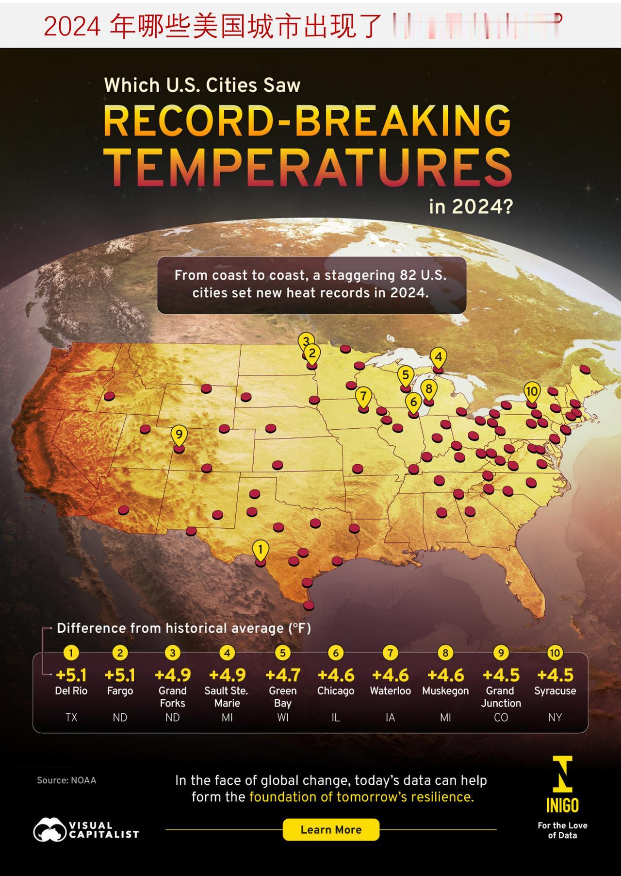 2024 年哪些美国城市出现了创纪录的高温? 全球气温正在不断上升——那么这种趋势在全美范围内是如何表现的呢?哪些地区受到了最严重的冲击? 下面图表展示了在 2024 年平均气温创下历史新高的美国城市。该数据来自美国国家海洋和大气管理局国家环境信息中心,并清晰地说明了哪些地区的高温情况最为严重。 ——气温上升 根据美国国家海洋和大气管理局国家环境信息中心的年度报告,2024 年是自 1850 年全球开始进行测量以来有记录以来最热的一年。在美国本土地区,这也是 130 年来最热的一年,平均气温为 55.5°F,比长期平均温度高出 3.5°F。 全球气温为何持续上升?其主要驱动因素是人为导致的气候变化,这种变化是由过度使用化石燃料所引发的。这一过程会将吸热的温室气体排放到大气中,从而加剧了地球的变暖现象。 随着人口的增长和工业化的推进,气温持续上升的趋势很可能会继续下去——除非采取重大且协调一致的措施来转向可再生能源并减少总体消耗。 ——美国气温最高的城市 2024 年全国平均气温创下历史新高,但这种高温并未在全美范围内均匀分布。 美国有 82 个城市创下了历史新高气温纪录,其中大多数位于北部和东北部地区,而这些地区通常并不以极端高温著称。 有几个城市的表现尤为突出,其数值较长期平均水平大幅上升: 得克萨斯州德尔里奥:比平均温度高出 5.1 华氏度 北达科他州法戈市:比平均气温高出 5.1 度华氏度 密歇根州苏圣玛丽:比平均温度高出 4.9 华氏度 北达科他州大福克斯:比平均气温高出 4.9 华氏度 威斯康星州格林湾:比平均气温高出 4.7 华氏度 ——未来的气候变化 随着全球气温持续上升,创纪录的高温天气出现的频率可能会进一步增加。这些变化将带来严重的后果,包括气候模式的改变以及更频繁、更严重的自然灾害。