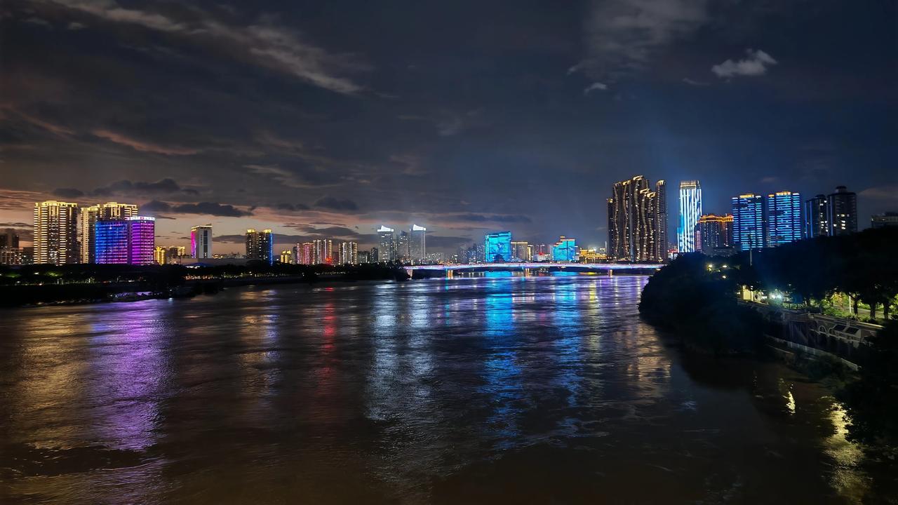 台风麦德姆来临前的夜晚,经过上次台风和上游洪涝后,现在南宁市邕江的水位已经很高了,希望这次邕江两岸的防洪堤能够继续挺住。