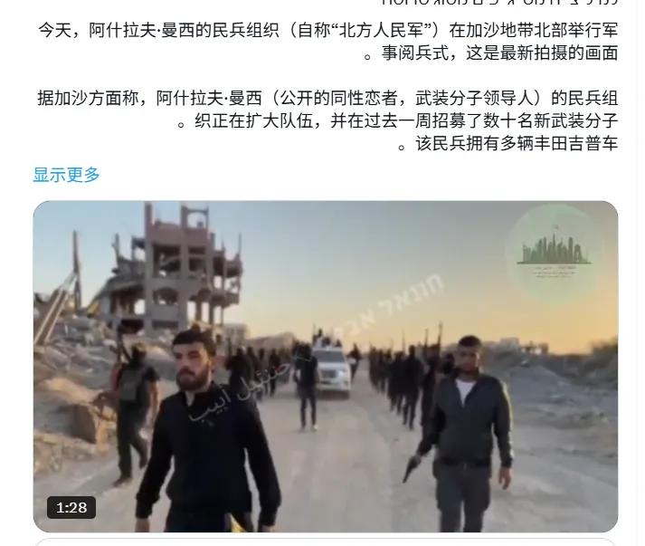 哈马斯退出加沙, 巴勒斯坦建国更是遥遥无期。 哈马斯的退出,导致加沙出现权力真空。 已经有新的武装派别出来游行, 来圈属自己的领地。 这只是开始,后续会有更多的武装出现。 但大概率都是亲以色列的, 这将导致加沙继续混乱, 无法接受法塔赫的统一领导! 以色列将会圈养这些武装力量, 它们的存在才会导致加沙局势动荡,而以色列才有理由继续保持高强度的军事力量。 可能就是养匪自重!