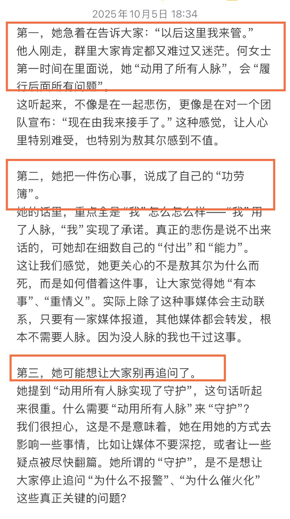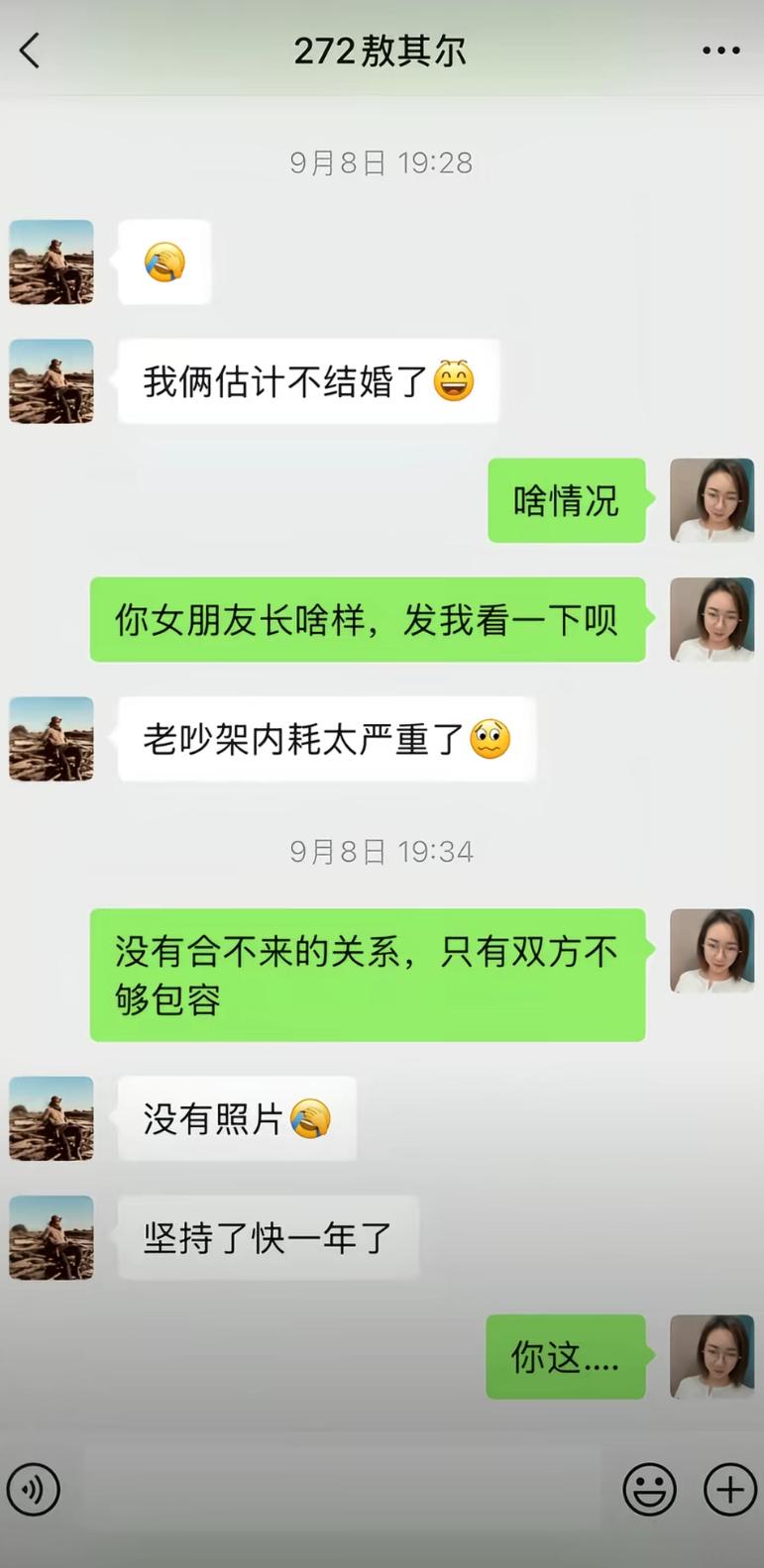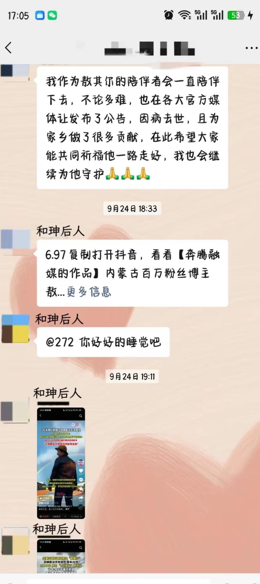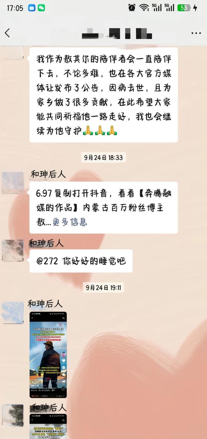 敖其尔走的实在是有些蹊跷啊!伴随着事件的进一步发展,网友发现了其女友的言行,果然有情况。 早前,来自内蒙的网红敖其尔不幸去世,由于讣告中透露其是因病去世,所以很多媒体“跟风”,当然这也不能怪媒体,毕竟谁也不知道这个账号起初并不是在敖其尔家人的手里,而是在其合作人,换一个说法便是女友的手里。 随后,家人通过其他方式拿回了账号,随即发布声明,透露敖其尔是因为坠车导致的噩耗。 关于为何坠车,所有的矛头都指向了其女友“和丽”,但从始至终她都没有发声,但在V信群里却有着她的发言,这一看就是有些急功近利,这也是为什么很多网友,就连家人都怀疑死因。 目前,最有效的方式便是解剖。 从探求到的聊天记录中可以发现,其女友对敖其尔的去世好像并没有多大的悲伤,另外,她对于接手“驿站”的事情很上心,马上就表示:现在由我来接手了。这真的是一对恋人在事后该说的事情吗? 动用了所有的人脉实现了对敖其尔的守护和承诺? 到底是什么样的事情,让其动用所有的人脉?这一切难道都比不上所谓的“死因”吗? 只能说,敖其尔走的很突然,也有些让人不理解,希望当地有关部门能够尽早给出答复。 至于敖其尔和女友的感情好像真的不好,他曾吐槽,与女友经常吵架,还说不结婚了。