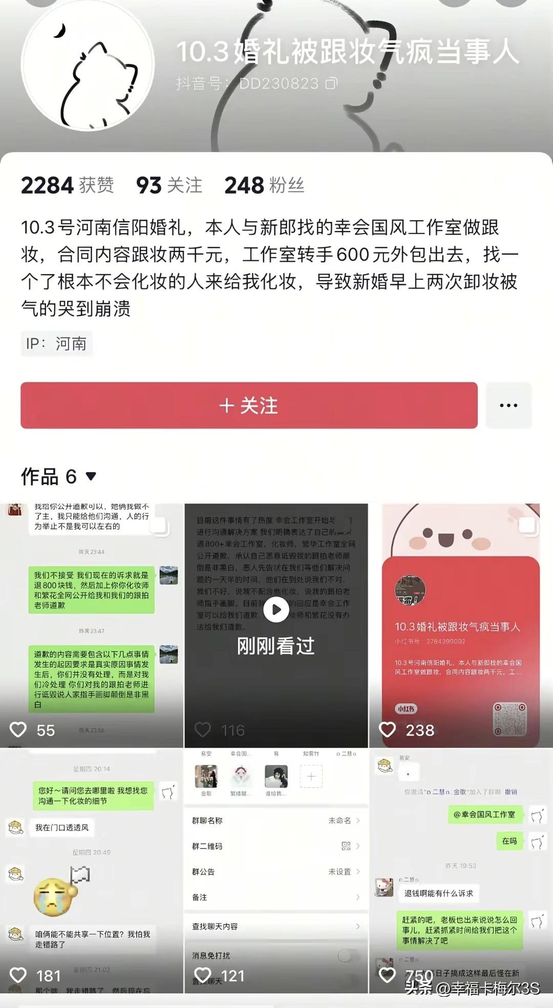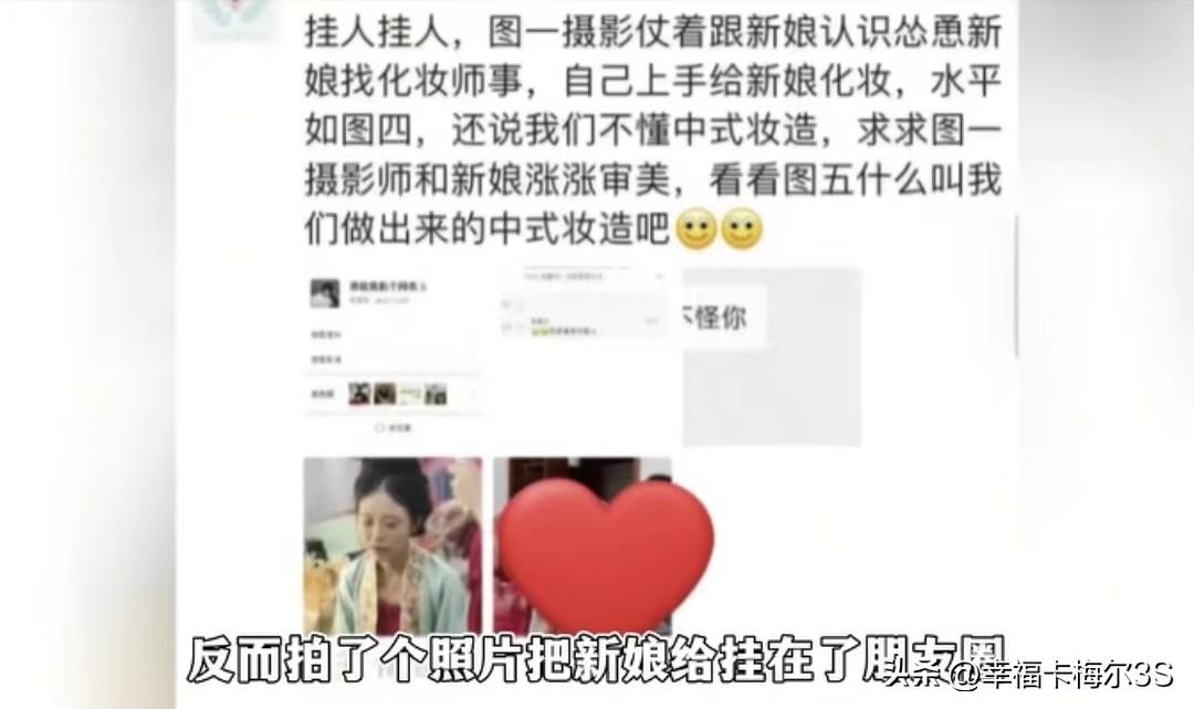 山东一新娘远嫁河南信阳,为了一生一次的婚礼,花2000块在当地“幸会国风工作室”订了跟妆。本想着一分钱一分货,结果婚礼当天凌晨4点半,看到自己的妆直接崩溃哭了! 化妆师给她画了个巨粉的眼影,叠加大地色后更是一言难尽。刷睫毛还弄到眼皮上,拿棉签沾水擦,越擦越脏。最后新娘只能自己动手,伴娘、摄影师齐上阵救场。 新娘后来才知道,自己付的2000块,工作室只给了化妆师600!但新娘没怪化妆师,打算婚礼后找工作室老板算账。结果这化妆师非但不领情,还把新娘的照片挂朋友圈吐槽说摄影师怂恿新娘找她麻烦。 新郎的妆也没好到哪去,眉毛被画成了蜡笔小新。因为这糟心的跟妆,婚礼吉时都耽误了。直到现在,这事还没解决,工作室那边还在“叫叫叫”,真是让人开了眼!