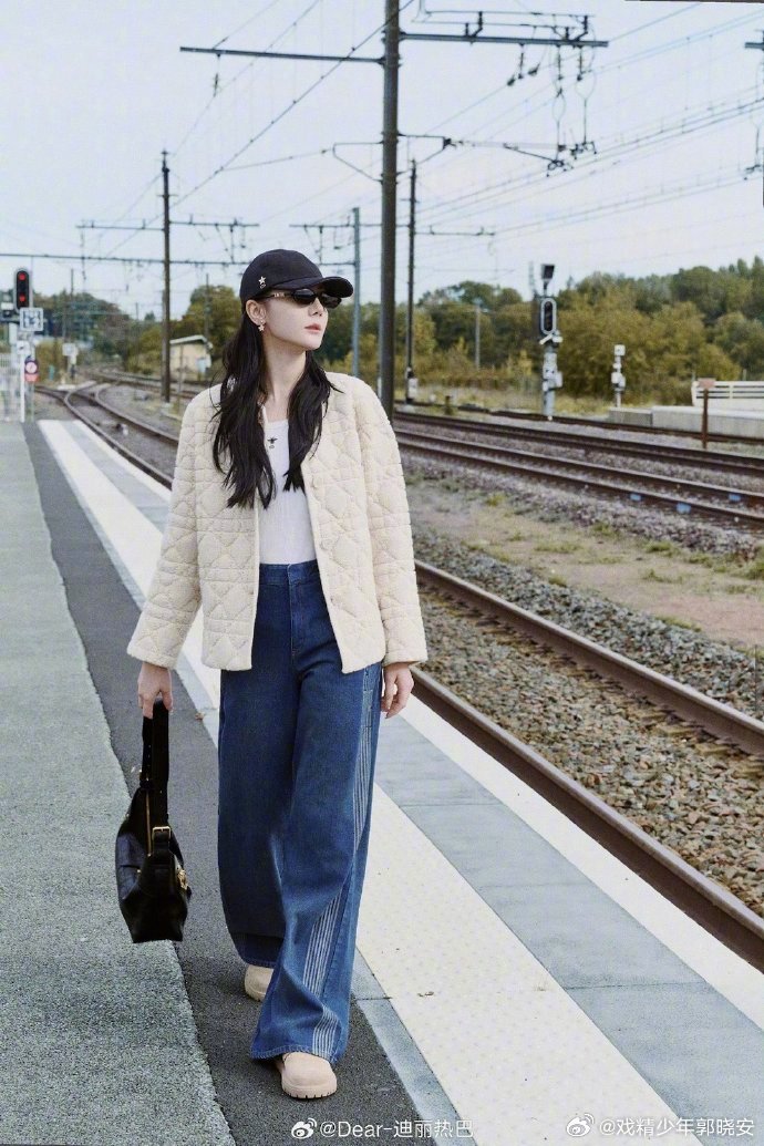 迪丽热巴巴黎时装周出发图造型让人眼前一亮慵懒却又不失高级[赢牛奶]迪丽热巴让人眼