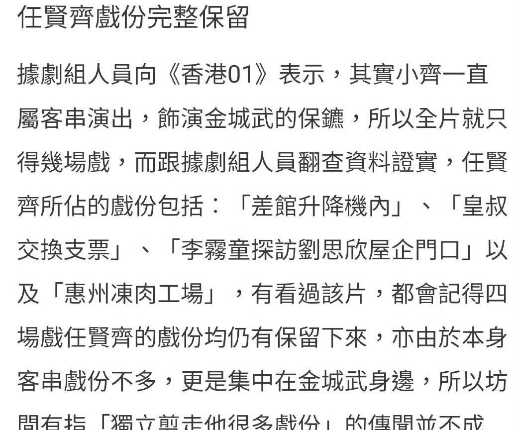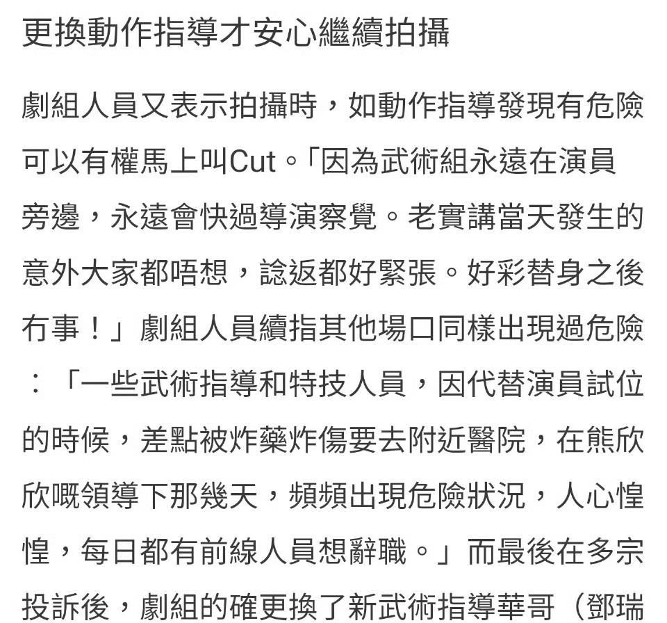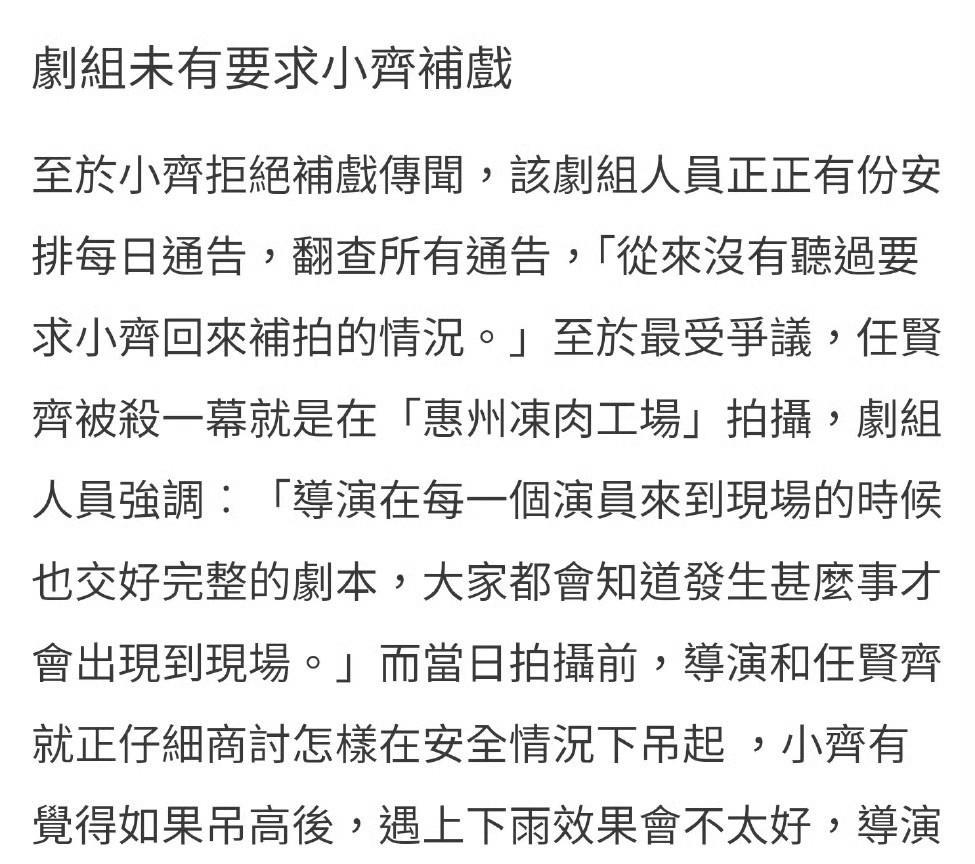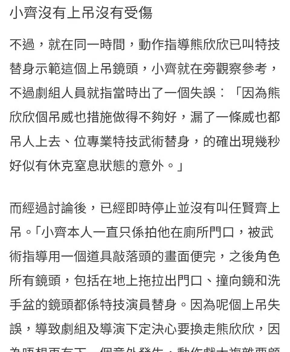 电影《风林火山》剧组回应传闻:没删任贤齐戏份;动作指导熊欣欣屡次出错被替换。 近日,电影《风林火山》前武术指导熊欣欣,在社交平台转发友人的帖子并配文:“一个不懂尊重别人的人,心理变态的人的作品,一定不值得期待。”疑似在暗指导演麦浚龙心理变态。 而网上也有传闻说导演麦浚龙删除任贤齐的戏份;任贤齐拍摄上吊戏受伤;还有任贤齐拒绝补拍等。对此,剧组也向港媒一一作出澄清。 同时还表示动作指导熊欣欣因为屡次出现失误,导致人心惶惶,所以才中途换掉他。