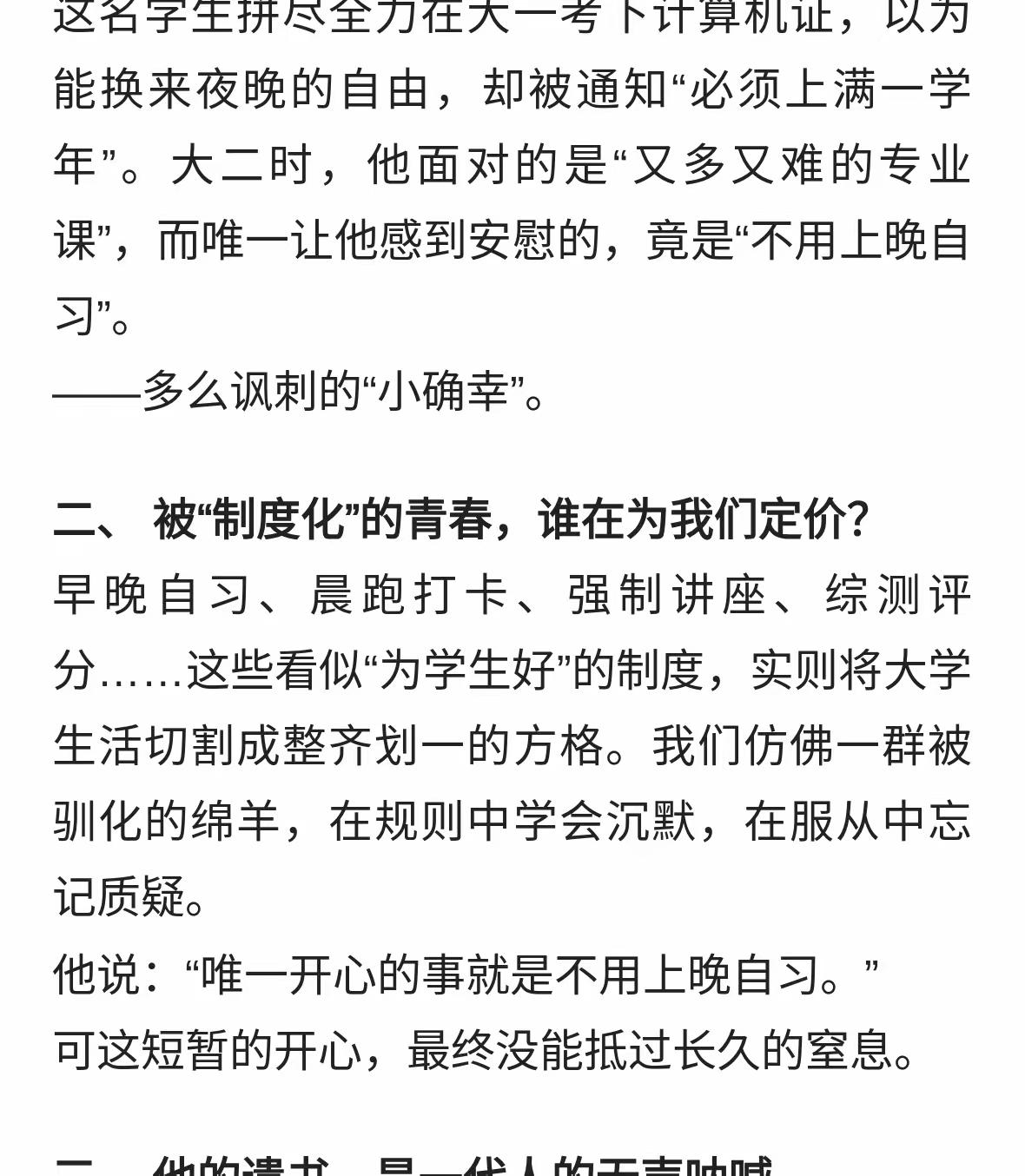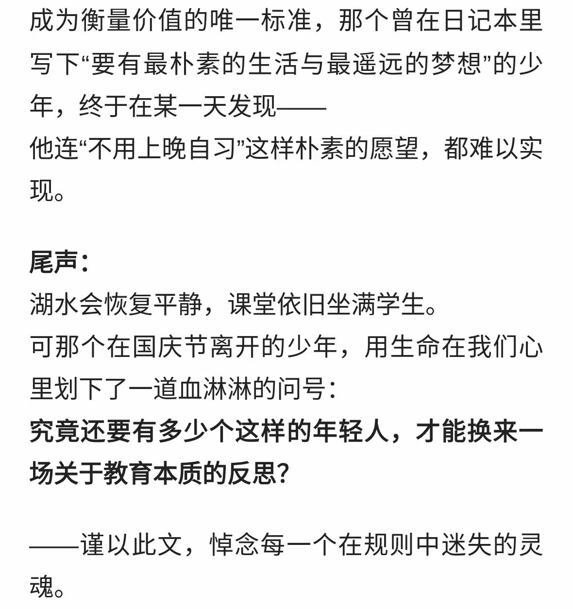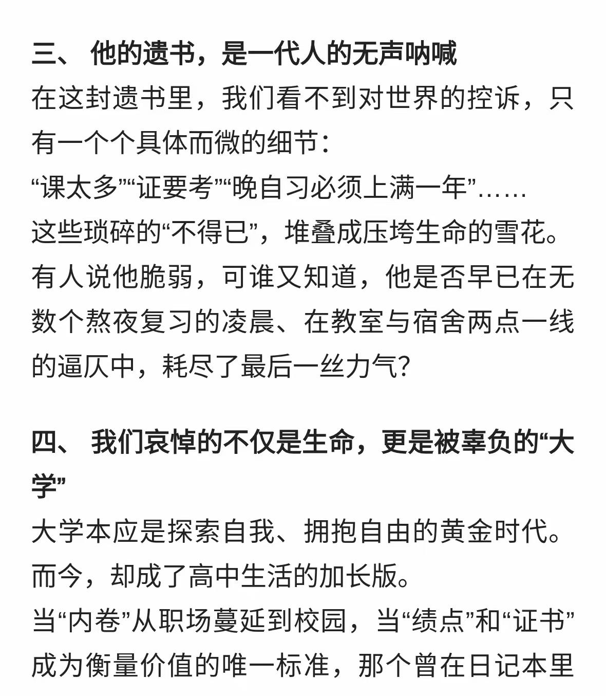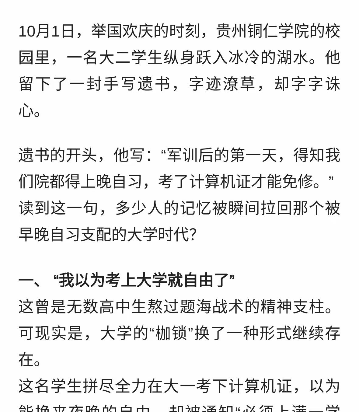 大二学生10月1日在校内跳湖轻生!他的遗书里写满了我们的青春债! 网友评论: 个人观点,仅供参考!跟学校一毛钱关系都没有!一心想死的人谁都拉不住!至于原因更是无稽之谈!没有规矩不成方圆!有多少学生有自制力能够像高中一样读完大学?!让自己的人生没有遗憾?!让自己的未来不留遗憾?!!!所以,这个学生的离开是他自己的问题!没有对生命的敬畏之心!没有对父母的爱和愧疚之心!没有对自己的爱护之心!没有勇敢面对生活压力的坚强之心!他的内心是怯弱的!他压根就不懂生活和生命的意义是什么!为孩子的父母感到惋惜,更为白发人送黑发人的悲凉感到痛心! 这样的学生,做出这样的选择,也算是恰如其分得偿所愿了。人生,可以说只有求学时候才是最轻松最没有压力的。毕竟,只要学习,不需要考虑其他的。 何苦,直接不读退学出来打工不就行了,哦可能不行,因为他也会因为了不满意打工而出事。总之应该是认知和心态出现了问题这样到了那里都是问题! 与走上社会打拼、谋生相比较,在大学里读书还算是幸福的,这点压力都无法承受,将来人生的坎坷、困难、无助……多得是! 这孩子是精神出问题了。高中三年本来情绪就绷得紧。突然之间发现上大学不是自己想的那么回事。然后就崩溃了。