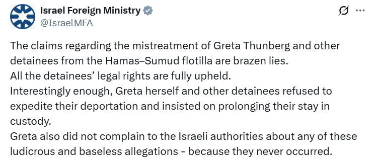 声明中写道,“颇有意思的是,格蕾塔本人及其他被拘留者均拒绝加速办理驱逐手续,反而坚持要延长拘留期间的滞留时间。对于这些荒唐且毫无根据的指控,格蕾塔也从未向以色列当局提出过任何投诉,因为这些事本来就没发生过。”