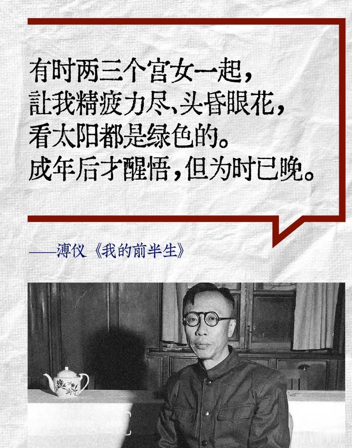 末代皇帝溥仪在他的自传里,曝光自己没有后代不能生育的原因是很小就被宫中的宫女们侵犯,搞垮了身体。 他说自己2岁进宫,太监们跑去打牌把他塞给宫女们带,长到十一二岁,寂寞的宫女们就轮番侵犯他,以至于他看太阳都是绿色的。 这是溥仪自己的说法,另有说法是溥仪沦为满洲国傀儡皇帝后,怕自己有了孩子,日本人不再需要他,被废位另立子嗣,他甚至亲手掐死了自己的骨肉。