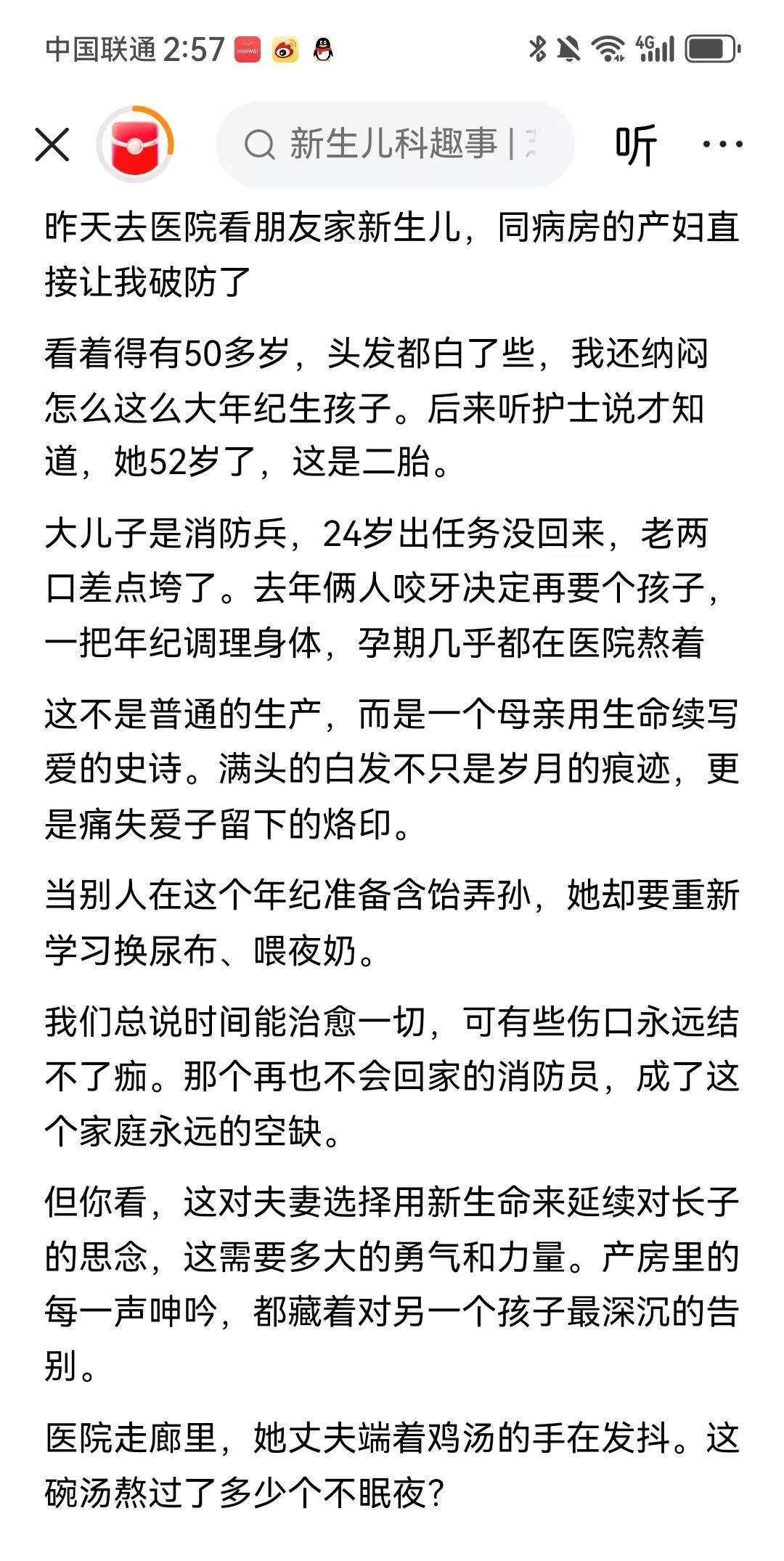 天呐!这得多大的勇气啊!失独的家庭精神没有了寄托不再生个孩子要痛苦一辈子的,祝福这位坚强的母亲母子平安,祝福这一家三口过上幸福顺遂的快乐好日子。 这位英雄妈妈有多大的勇气才敢在这样的年龄产子,向英雄妈妈致敬。 坚强伟大的母亲,大儿子托新生儿给了母亲力量希望寄托! 哎,我隔壁邻居两个月前也是失去了唯一的儿子,一场意外,连我们邻居都跟着心痛,何况他们家人,这种丧子之痛无可替代。 伟大的母亲,没有,在打击面前沉沦,尽最大的能力让生命升华,可赞可叹。 心里难受,别人这个年纪都当奶奶了,从新当妈,到了70岁孩子才成年,不过这个年龄还能成功生育,恭喜恭喜了。 这样的妈妈我们必须祝福,至少她以后的日子有盼头!这妈妈是超人,但那娃将来的成长道路却让人担忧。
