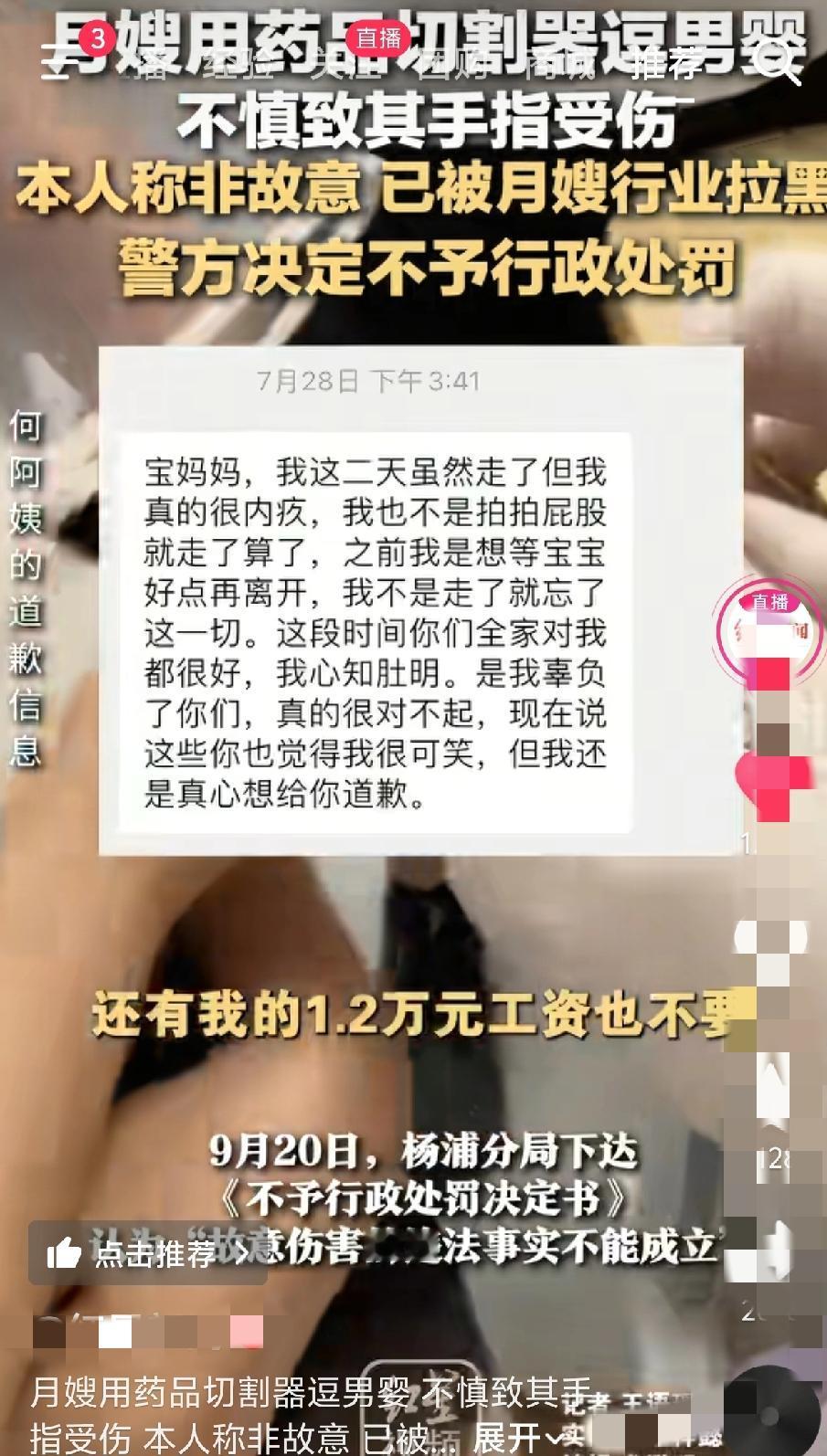 “万万没想到!”上海一名月嫂用药品切割器逗宝宝玩。结果没一会儿宝宝便大哭了起来。然而月嫂在检查时,竟然发现切割器上面有刀片。月嫂觉得非常的不可思议,就因为自己的一个疏忽却被整个行业拉黑了。 不得不说这个月嫂也是挺倒霉的。照顾9个月的小宝宝时,拿药品切割器逗孩子玩,不慎将孩子的手划伤。月嫂也不是故意的,毕竟她没有看到那个上面有刀片。月嫂愿意承担医药费,为了表达歉意12000的工资也不要了。 网友热议,确实无心之失,工资+医药费好几万没了,还有以后不能从事相关工作,这个月嫂也是损失惨重。 不管怎么样,宝宝是因为月嫂的原因才受的伤,哪个家长都接受不了孩子受伤。 对此事,你怎么看?