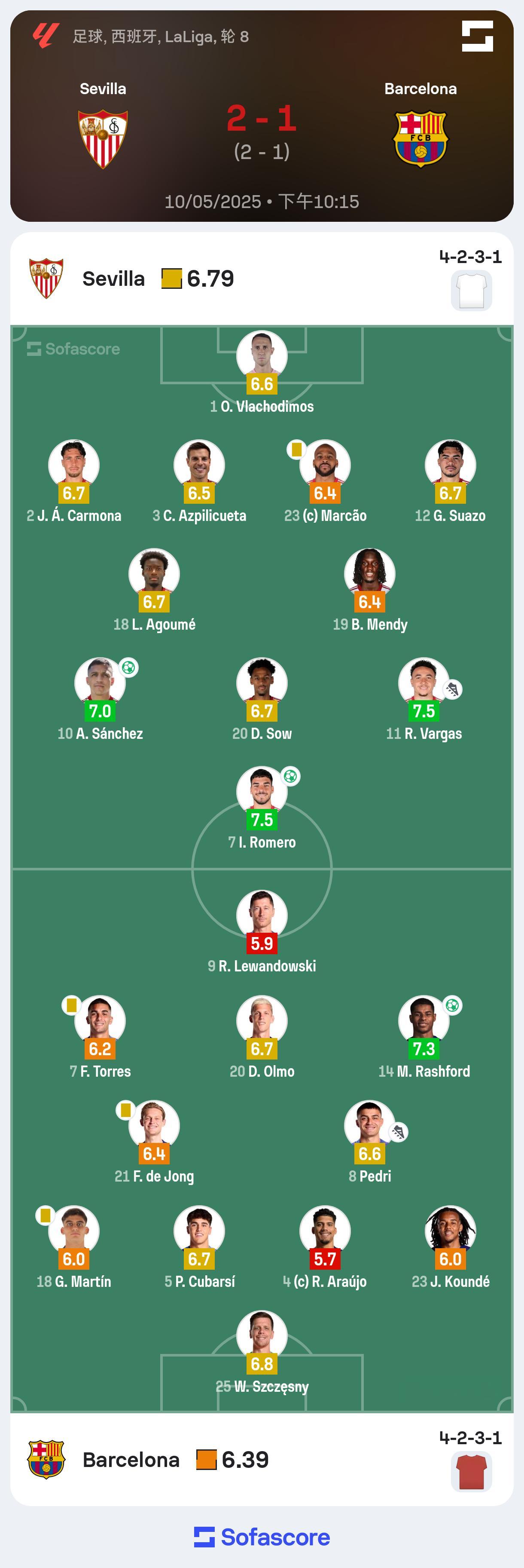 塞维利亚2-1巴萨上半场比赛评分……塞维利亚vs巴萨热点现场巴萨
