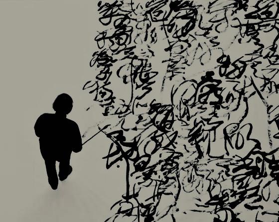 这个书法家的灵感真出乎我的意料。 当这位书法家辛辛苦苦的把这“盘根错节”体写到最后时突然毛笔中滴下一坨墨汁,这时侯的书法家不慌不忙灵机一动顺势几笔画了个人物,人物的比例恰到好处 手里还拿着一支笔在写字。 看完这幅图感到这书法家的水平真不低,我真佩服他画的人物形象透视关系掌握的很不错,由此看来,此书法家还是有点长处的。
