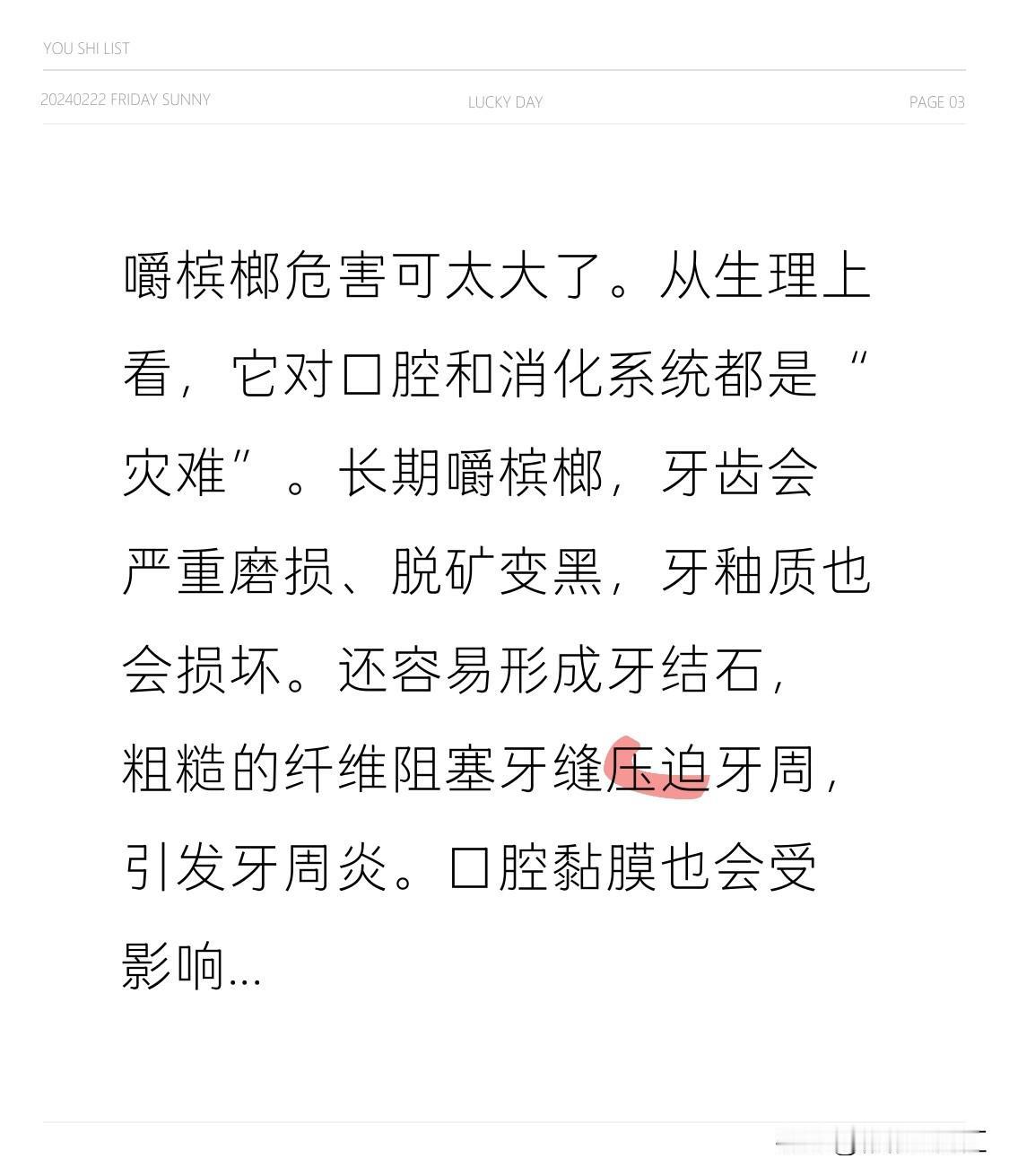 嚼槟榔危害可太大了。从生理上看,它对口腔和消化系统都是“灾难”。长期嚼槟榔,牙齿会严重磨损、脱矿变黑,牙釉质也会损坏。还容易形成牙结石,粗糙的纤维阻塞牙缝压迫牙周,引发牙周炎。口腔黏膜也会受影响,引发白斑,甚至导致口腔癌,2003年槟榔就被列为1级致癌物,88%的口腔癌患者有嚼槟榔习惯。消化系统也难幸免,会损害味觉神经和唾液分泌,槟榔渣还可能损伤胃壁,严重时胃穿孔。 此外,还有经济等危害。台湾有超260万人嚼槟榔,一年花费达900多亿,真该戒掉这习惯!