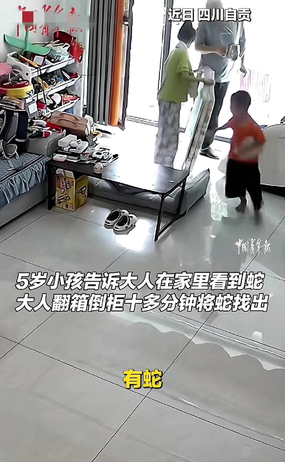 “不速之客!”四川自贡一个5岁小孩告诉大人在家里面看到了一条蛇,结果大人就开始翻