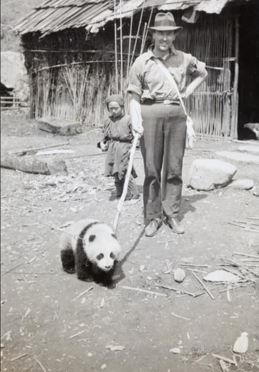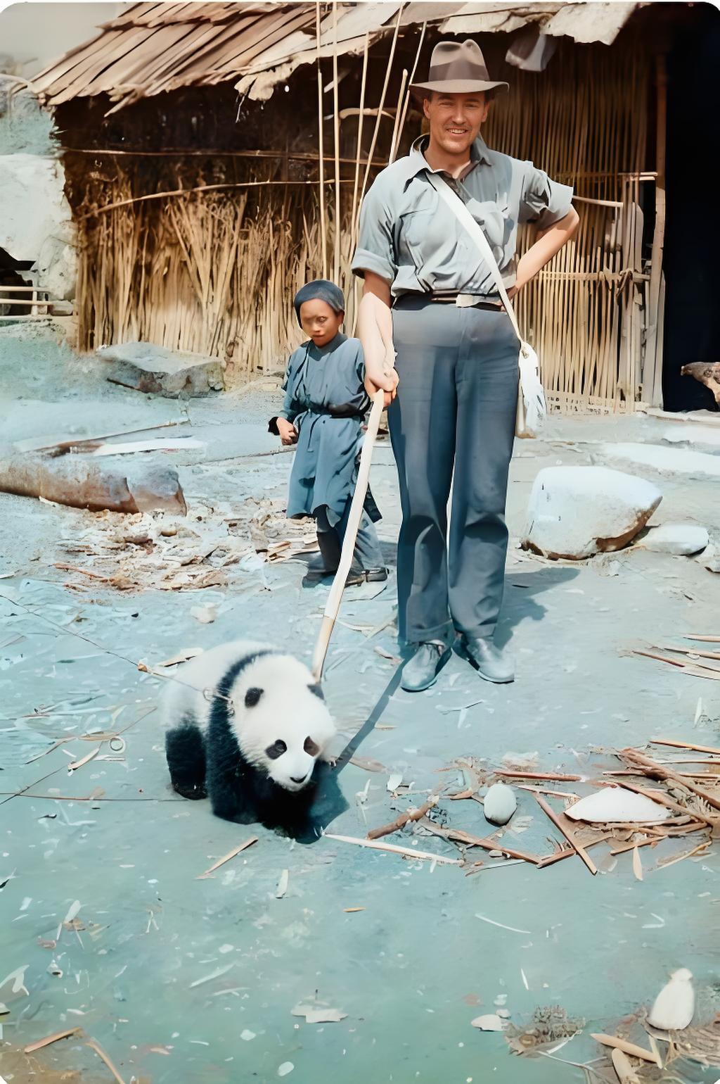 1937年的四川山区,一张老照片定格了一名外国人竟手牵着一只活体大熊猫,在崎岖山