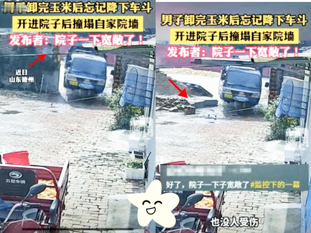 男子开农用车卸完玉米回家, 没想到竟把院墙撞塌了, 这心态绝了! 山东德州一男
