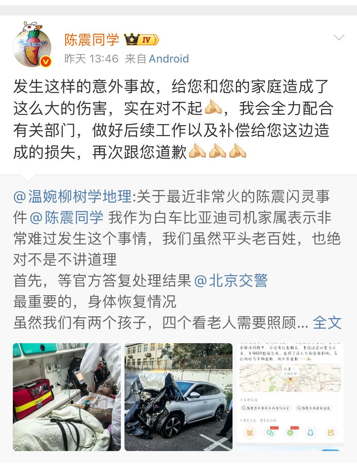 陈震这次要“大出血”了吗? 事故发生后,白色比亚迪车主注册微博迅速发声,同时聘请律师诉讼陈同学。明眼人一看就知道对方想要钱。而且是狮子大开口的那一种。(对方赌的是陈震的大V形象和负面舆论影响) 陈同学每一次表态都是全力配合,不推卸责任。 可以理解为发生大的舆论事件后,双方对事件的发声都需要谨遵律师。