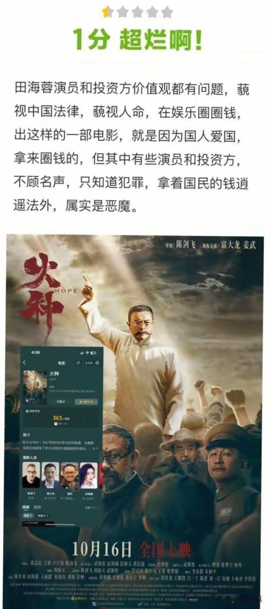 火种因为一个人的原因导致被全网抵制,10月16号上映,10月6号预售只有8055元,想看人数也只有518。 田海蓉在这里面饰演的是,李大钊的夫人,不仅支撑着整个家庭,更是李大钊坚定的支持者,在当时是一个有魄力,人格高尚的女性。 题材很好,内容也很正义,有姜武等许多实力演员在里面,但是出现了一个德不配位的女演员,来演就很讽刺,藐视中国法律,在娱乐圈圈钱,出这样一部电影,利用爱国者挣钱,被观众打出了一分的高分。 照目前的形势,只能重拍了,因为演员个人的道德品质导致电影出现问题,演员需要赔偿制片方损失。 导演组也没有办法了,不可能因为她一个人冒着风险上架,最后什么都没捞到,还要被观众们,打上一个价值观有问题。 作为一个公众人物,要时刻注意自己的所作所为,人民给你饭吃,你就要懂得尊重人民。
