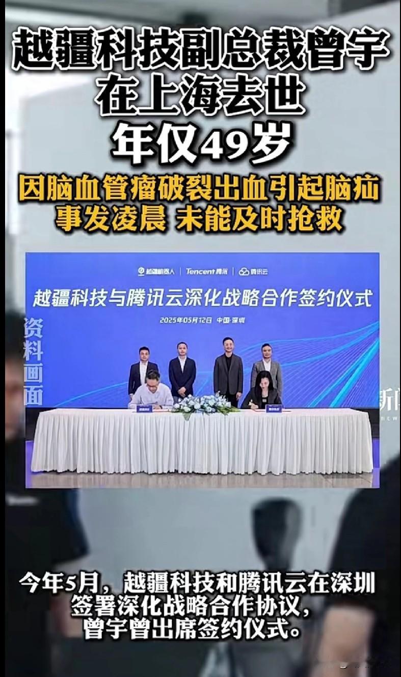 家人们,看到越疆科技副总裁曾宇去世的消息,心里真不是滋味…才49岁,因为脑血管瘤破裂没抢救过来😔 咱们平时真得重视身体健康啊,别光顾着忙工作,身体垮了啥都白搭。希望曾总一路走好,也提醒大家定期体检,别把小病拖成大问题,健康才是最大的财富啊…
