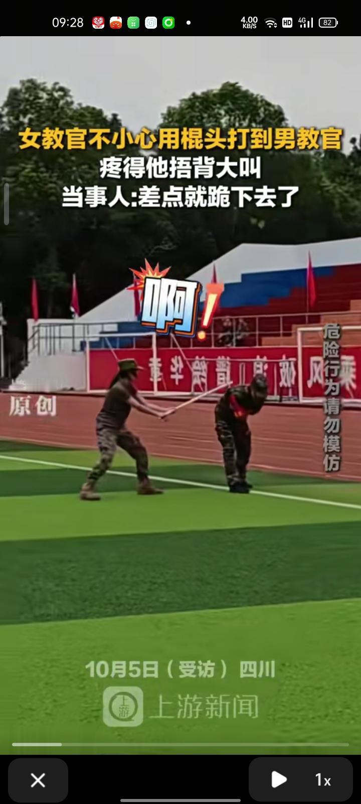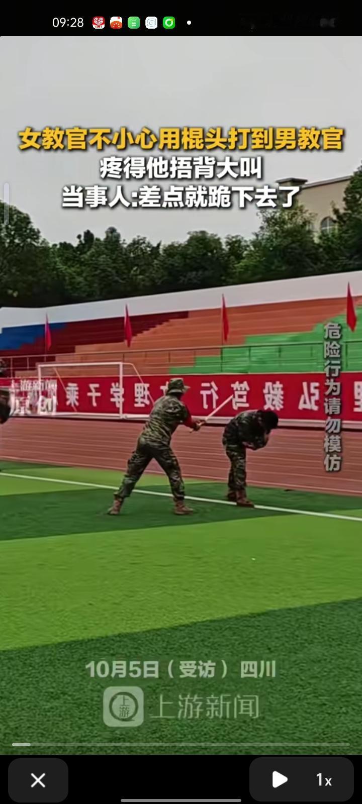 10月3日,四川成都。女教官不小心用棍头打到男教官,棍子没断,他却疼得他捂背大叫,差点跪下去了。人家都是打棍子中间,她却打棍子前端。