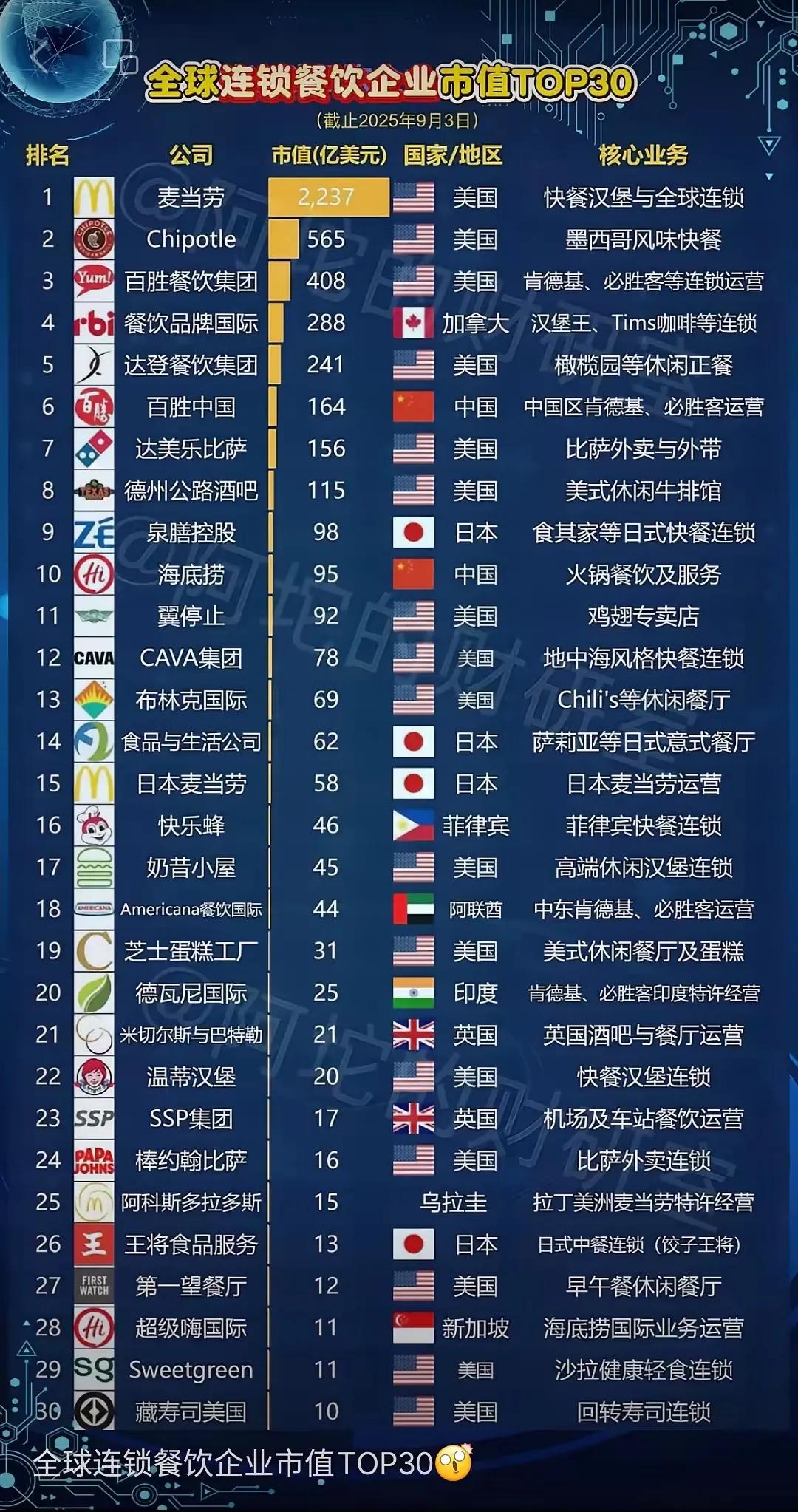 看这榜单,这些公司大多数是出产汉堡、比萨、炸鸡、薯条之类的食品。 咱们中餐美食几乎可以满足任何人的口味,而且文化渊远流长,可以讲述的故事数不胜数,为什么就走不出去?