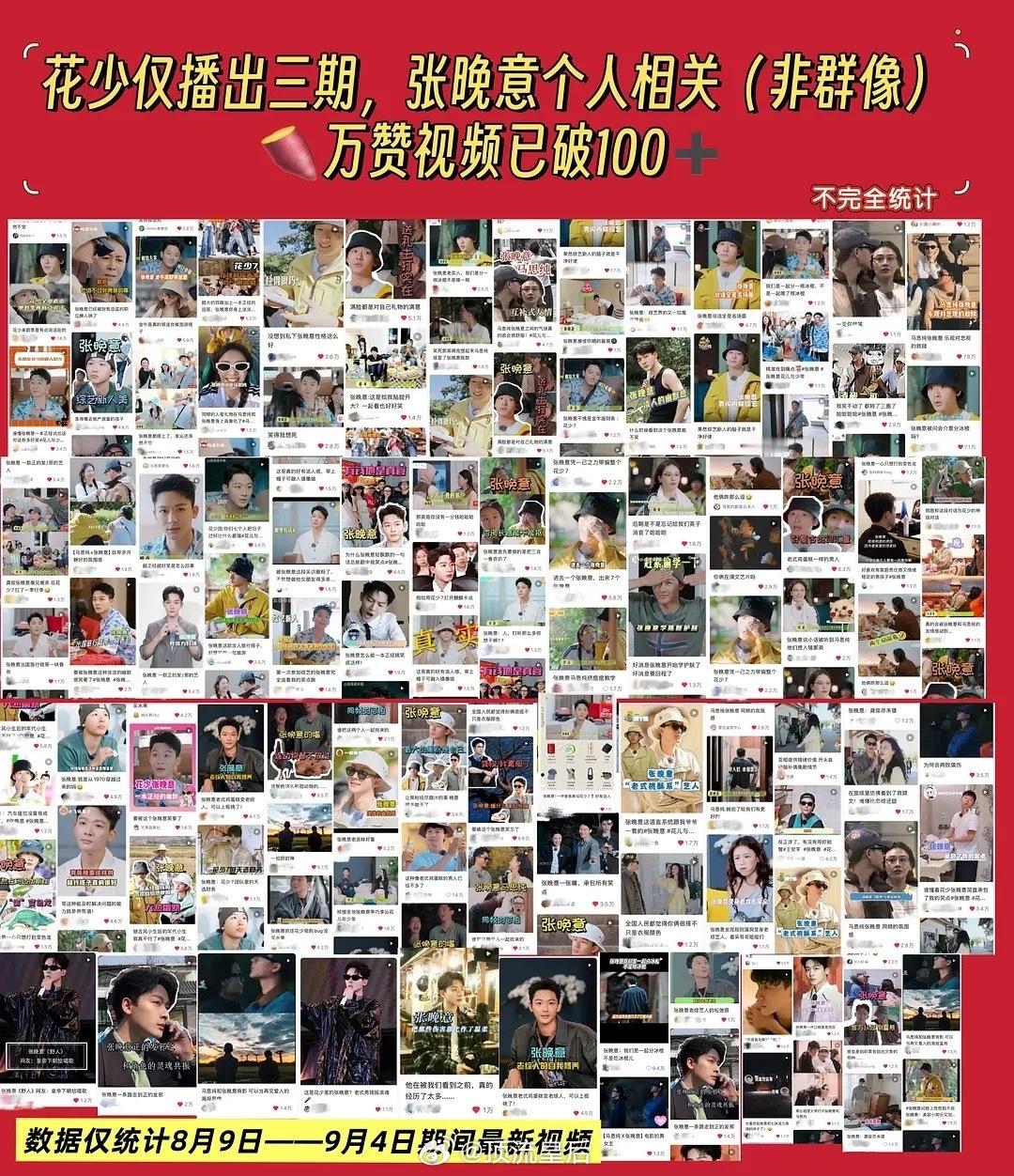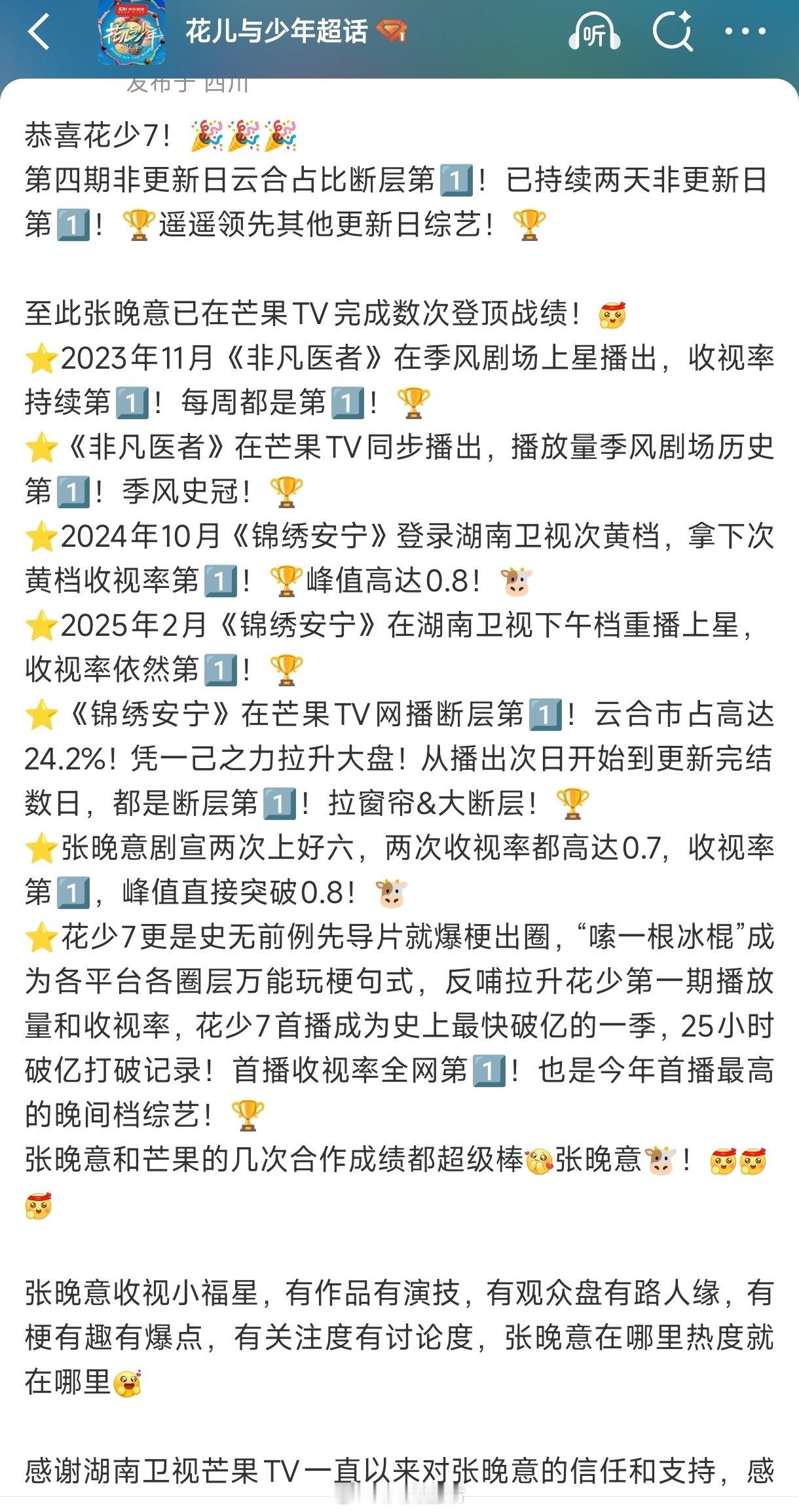 张晚意和湖南卫视、芒果TV播的影视作品和综艺成绩都很好。湖南卫视置顶了张晚意花少7宣传贴。连续发了非凡医者、锦绣安宁花絮采访还有花少综艺等切片